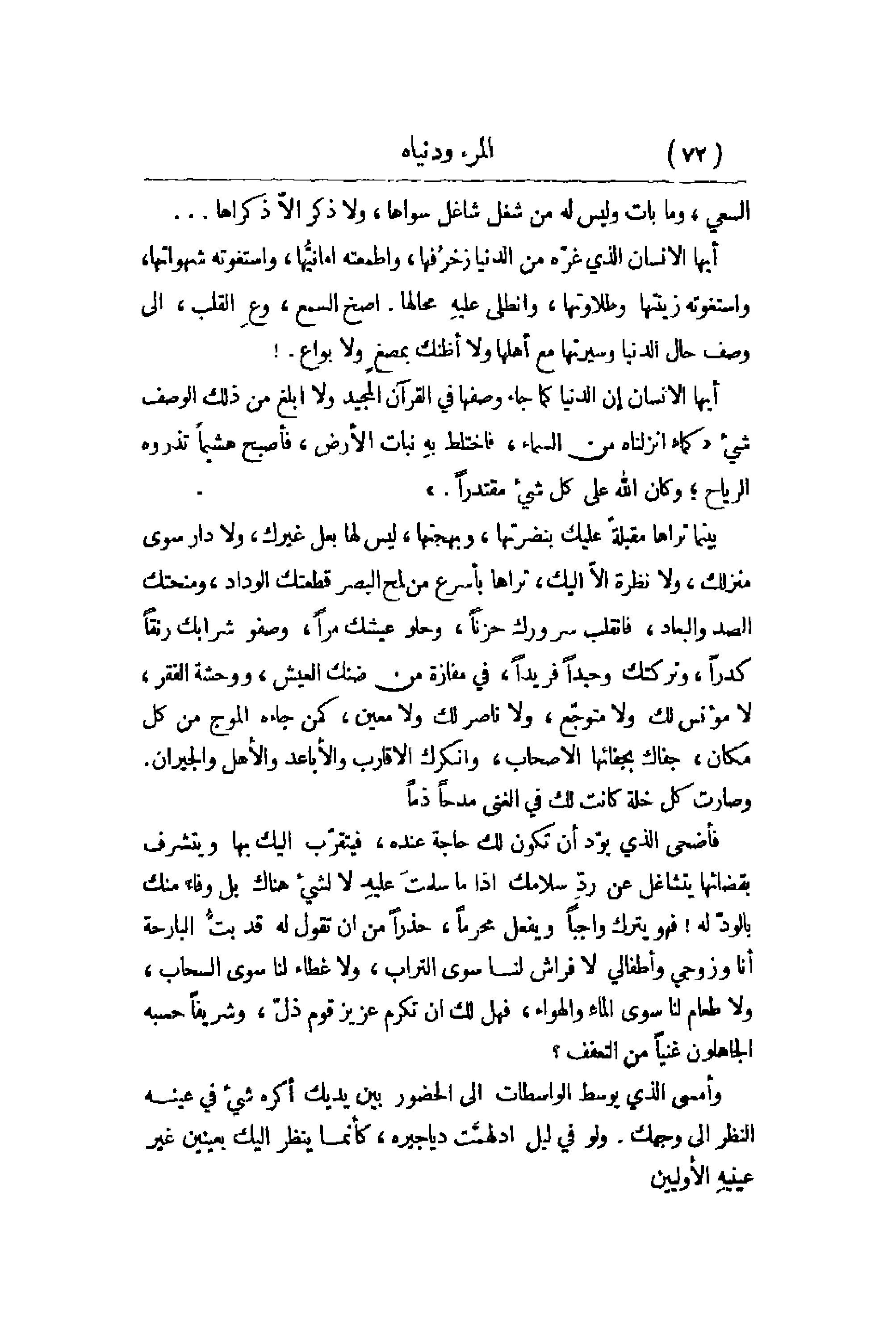 السعي , وما بات وليس له من شغل شاغل سواها , ولا ذكر إلاّ ذكراها. . . أيها الإنسان الذي غرّه من الدنيا زخرُفها , وأطمعته أمانيُّها , واستغوته زينتها وطلاوتها , وانطلى عليهِ محالها. أصخ السمع , وعِ القلب , إلى وصف حال الدنيا وسيرتها مع أهلها ولا أظنك بمصغٍ ولا بواع! أيها الإنسان إن الدنيا كما جاء وصفها في القرآن المجيد ولا أبلغ من ذلك الوصف شيء كما أنزلناه من السماء , فاختلط بهِ نبات الأرض , فأصبح هشيماً تذروه الرياح؛ وكان الله على كل شيء مقتدراً بينما تراها مقبلةً عليك بنضرتها , وبهجتها , ليس لها بعل غيرك , ولا دار سوى منزلك , ولا نظرة إلاّ إليك , تراها بأسرع من لمح البصر قطعتك الوداد , ومنحتك الصد والبعاد , فانقلب سرورك حزناً , وحلو عيشك مراً , وصفو شرابك رنقاً كدراً , وتركتك وحيداً فريداً , في مفازة من ضنك العيش , ووحشة الفقر , لا مؤنس لك ولا متوجّع , ولا ناصر لك ولا معين , كمن جاءه الموج من كل مكان , جفاك بجفائها الأصحاب , وأنكرك