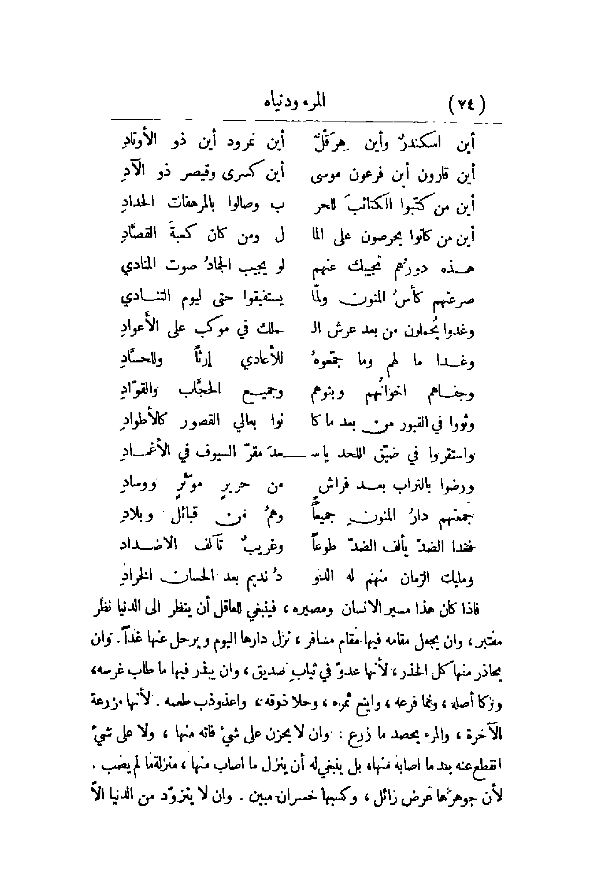 فإذا كان هذا مسير الإنسان ومصيره , فينبغي للعاقل أن ينظر إلى الدنيا نظر معتبر , وإن يجعل مقامه فيها مقام مسافر , نزل دارها اليوم ويرحل عنها غداً. وإن يحاذر منها كل الحذر , لأنها عدوّ في ثيابِ صديق , وإن يبذر فيها ما طاب غرسه , وزكا أصله , ونما فرعه , وأينع ثمره , وحلا ذوقه , واعذوذب طعمه. لأنها مزرعة الآخرة , والمرء يحصد ما زرع. وإن لا يحزن على شيء فاته منها , ولا على شيء انقطع عنه بعد ما أصابه منها , بل ينبغي له أن ينزل ما أصاب منها , منزلة ما لم يصب. لأن جوهرّها عرض زائل , وكسبها خسران مبين. وإن لا يتزوّد من الدنيا إلاّ