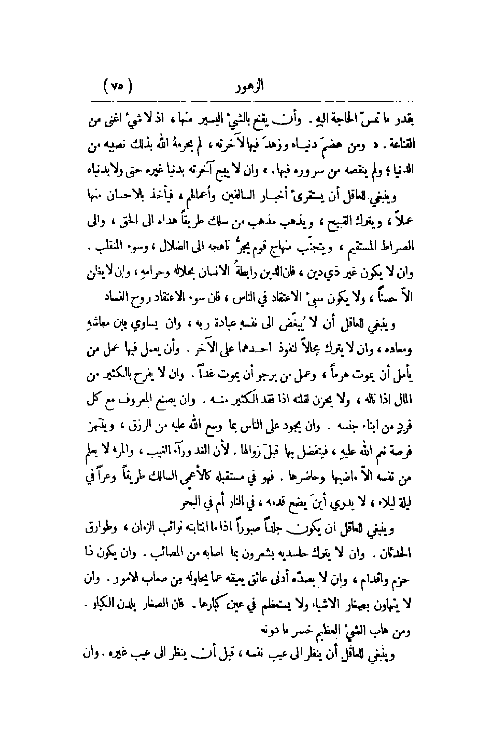 غيره حتى ولا بدنياه. وينبغي للعاقل أن يستقرئ أخبار السالفين وأعمالهم , فيأخذ بالإحسان منها عملاً , ويترك القبيح , ويذهب مذهب من سلك طريقاً هداه إلى الحق , وإلى الصراط المستقيم , ويتجنّب منهاج قوم يجرُّ ناهجه إلى الضلال , وسوء المنقلب. وإن لا يكون غير ذي دين , فإن الدين رابطةُ الإنسان بحلاله وحرامهِ , وإن لا يظن إلاّ حسناً , ولا يكون شيء الاعتقاد في الناس , فإن سوء الاعتقاد في الناس , فإن سوء الاعتقاد روح الفساد. وينبغي للعاقل أن لا يُبغّض إلى نفسه عبادة ربه , وإن يساوي بين معاشهِ ومعاده , وإن لا يترك مجالاً لنفوذ أحدهما على الآخر. وأن يعمل فيها عمل من يأمل أن يموت هرماً , وعمل من يرجو أن يموت غداً. وأن لا يفرح بالكثير من المال إذا ناله , لا يحزن لقلته إذا فقد الكثير منه. وإن يصنع المعروف مع كل فردٍ من أبناء جنسه. وإن يجود على الناس بما وسع الله عليه من الرزق , وينتهز فرصة نعم الله عليهِ , فيتفضل بها قبلَ زوالها. لأن الغد وراء الغيب , والمرءُ لا يعلم من نفسه إلاّ ماضيها وحاضرها. فهو في مستقبله كالأعمى المسالك طريقاً وعراً في ليلة ليلاء , لا يدري أينَ يضع قدمه , في النار أم في البحر. وينبغي للعاقل أن يكون جلداً صبوراً إذا ما انتابته نوائب الزمان , وطوارق الحدثان. وإن لا يترك حاسديه يشعرون بما أصابه من المصائب. وأن يكون ذا حزم وإقدام , وأن لا يصدّه أدنى عائق يعيقه عما يحاوله من صعاب الأمور. وأن لا يتهاون بصغار الأشياء ولا يستعظم في عين كبارها. فإن الصغار يلدن الكبار. ومن هاب الشيء العظيم خسر ما دونه. وينبغي للعاقل أن ينظر على عيب نفسه , قبل أن ينظر إلى عيب غيره. وأن