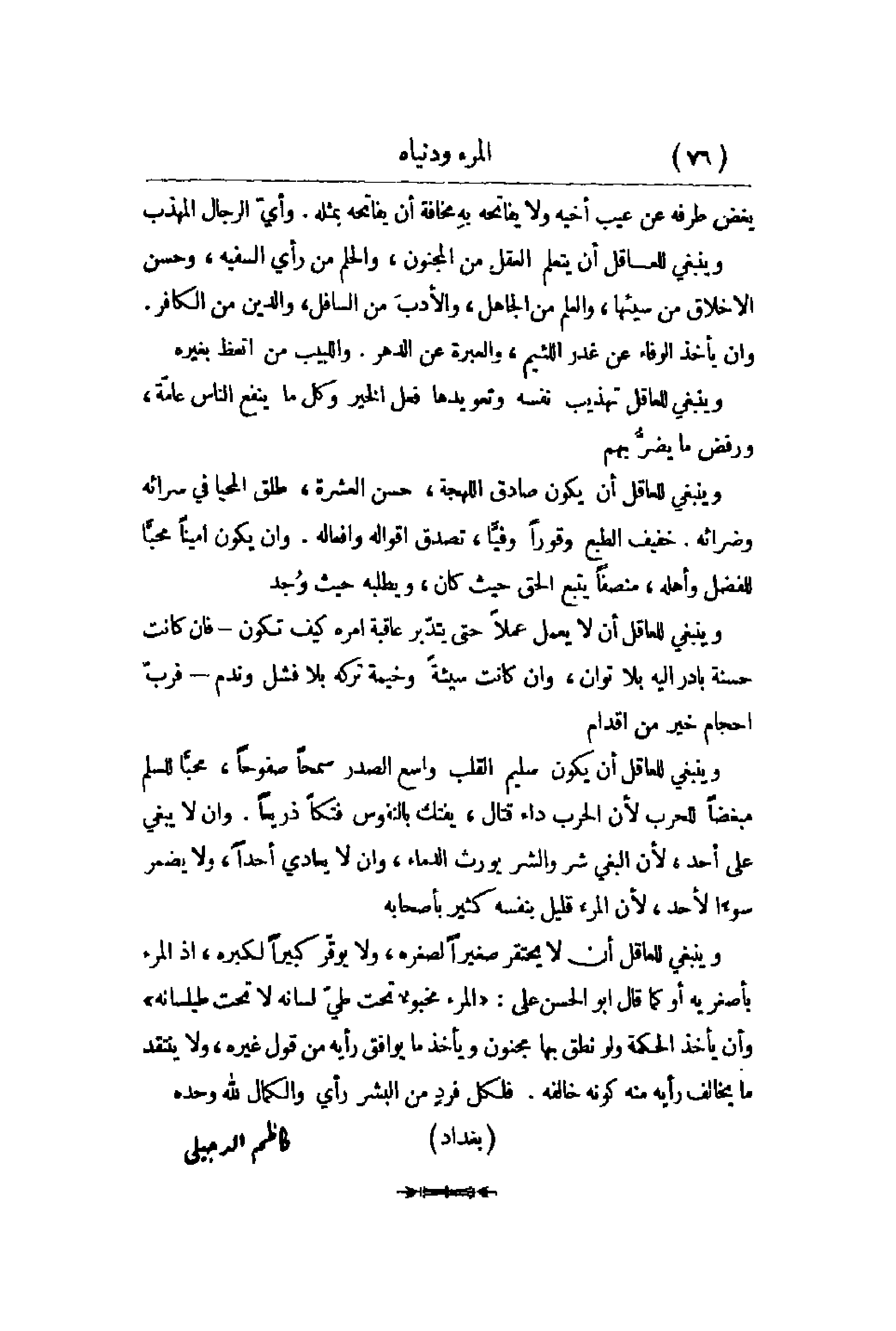 يغض طرفه عن عيب أخيه ولا يفاتحه بهِ مخافة أن يفاتحه بمثله. وأيّ الرجال المهذب وينبغي للعاقل أن يتعلم العقل من المجنون , والحلم من رأي السفيه , وحسن الأخلاق من سيئها , والعلم من الجاهل , والأدبَ من السافل , والدين من الكافر. وأن يأخذ الوفاء عن غدر اللئيم , والعبرة عن الدهر. واللبيب من اتعظ بغيره. وينبغي للعاقل تهذيب نفسه وتعويدها فعل الخير وكل ما ينفع الناس عامّة , ورفض ما يضرُّ بهم. وينبغي للعاقل أن يكون صادق اللهجة , حسن العشرة طلق المحيا في سرائه وضرائه. خفيف الطبع وقوراً وفيّاً , تصدق أقواله وأفعاله. وأن يكون أميناً محبَّا للفضل وأهله , منصفاً يتبع الحق حيث كان , ويطلبه حيث وُجد. وينبغي للعاقل أن يكون سليم القلب واسع الصدر سمحاً