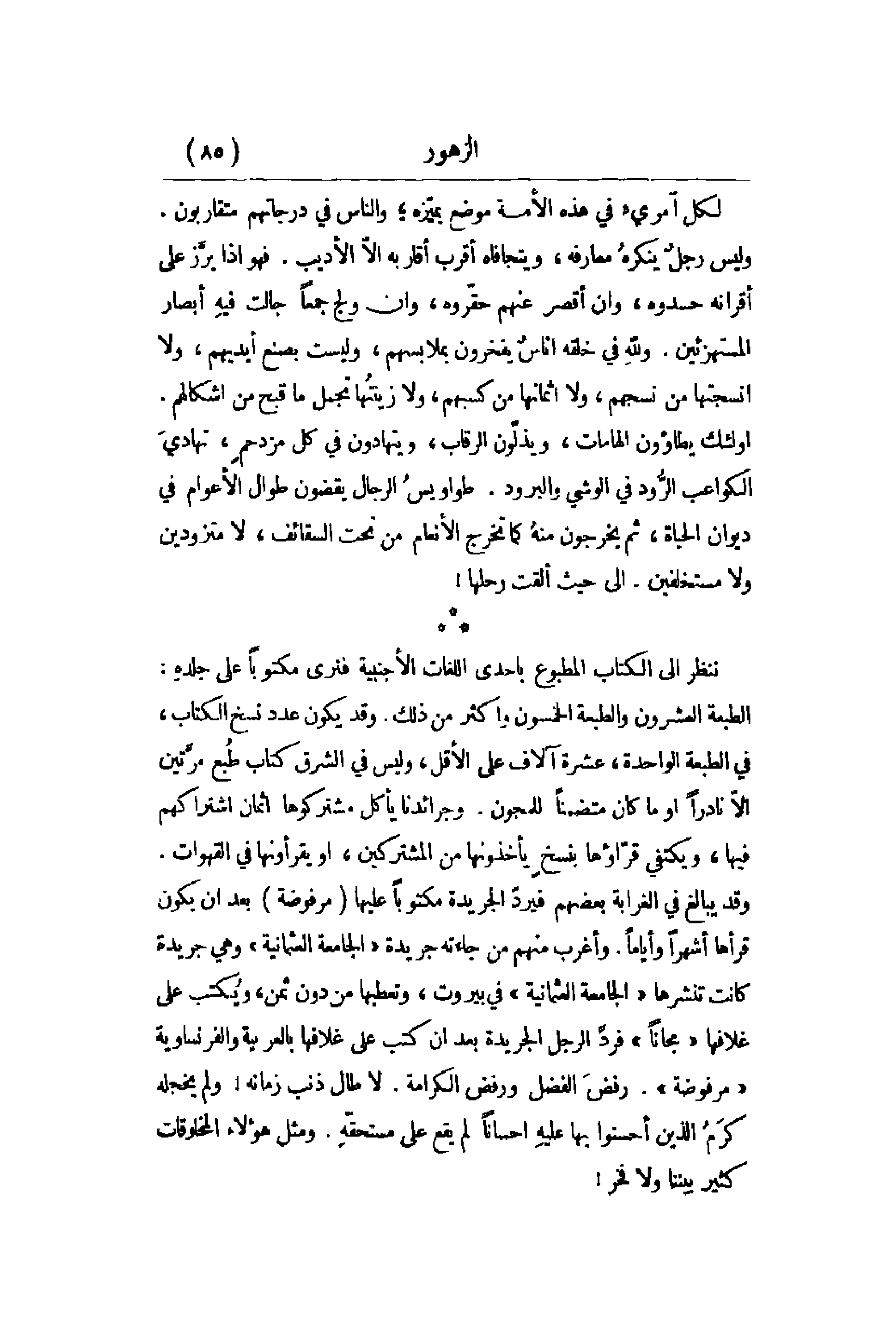 المطبوع بإحدى اللغات الأجنبية فنرى مكتوباً على جلدهِ: الطبعة العشرون والطبعة الخمسون وأكثر من ذلك. وقد يكون عدد نسخ الكتاب , في الطبعة الواحدة , عشرة آلاف على الأقل , وليس في الشرق كتاب طُبع مرَّتين إلاّ نادراً أو ما كان متضمناً للمجون. وجرائدنا يأكل مشتركوها أثمان اشتراكهم فيها , ويكتفي قرّاؤها بنسخٍ يأخذوها من المشتركين , أو يقرأونها في القهوات. قرأها أشهراً وأياماً. وأغرب منهم من جاءته جريدة الجامعة العثمانية وهي جريدة كانت تنشرها الجامعة العثمانية وهي بيروت , وتعطيها من دون ثمن , ويُكتب على غلافها مجاناً فردَّ الرجل الجريدة بعد أن كتب على غلافتها بالعربية والفرنساوية مرفوضة. رفضَ الفضل ورفض الكرامة. لا طال ذنب زمانه! ولم يخجله كرَمُ الذين أحسنوا بها عليهِ إحساناً لم يقع على مستحقّهِ ومثل هؤلاء المخلوقات كثير بيننا ولا فخر!