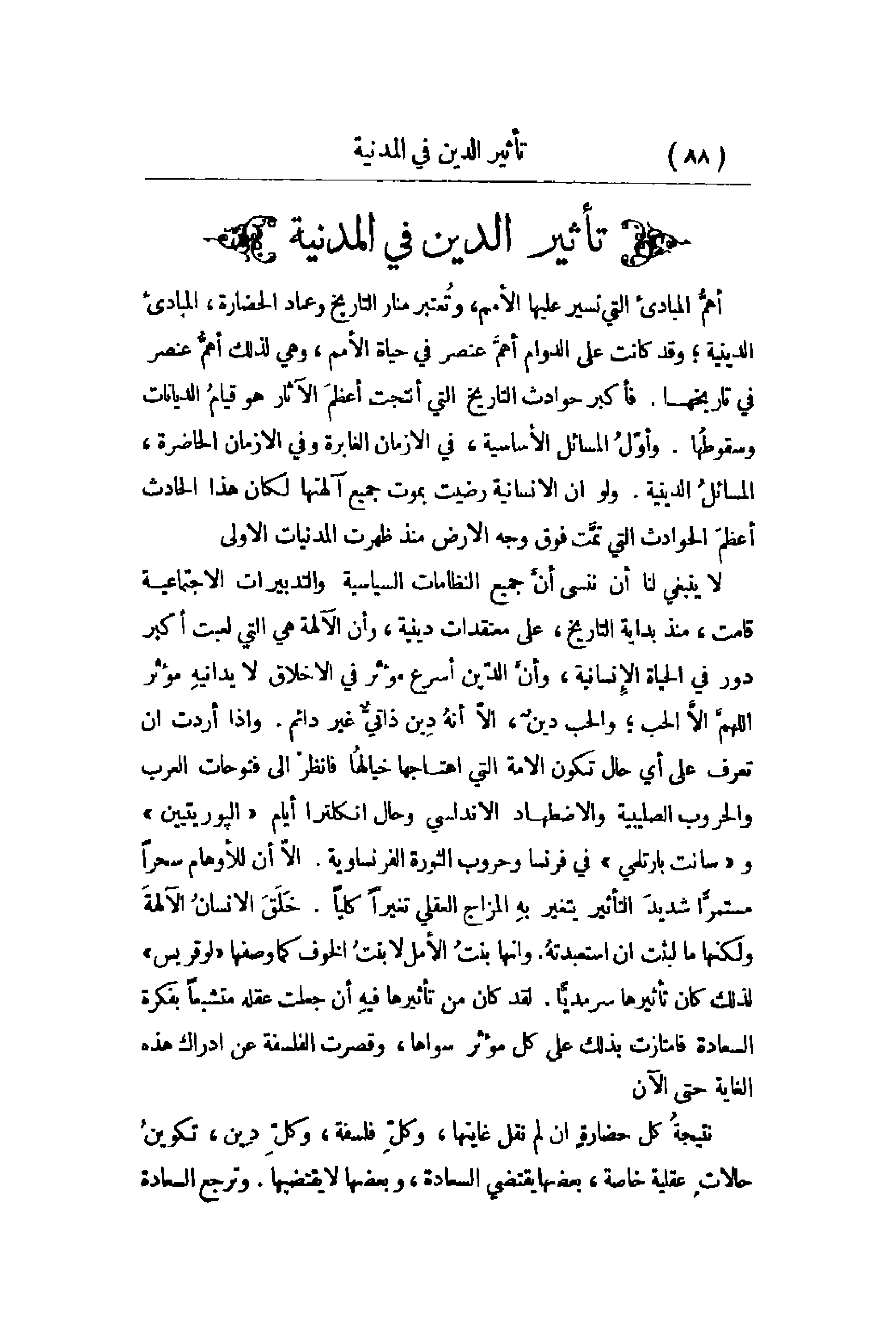 أهمُّ المبادئ التي تسير عليها الأمم , وتُعتبر منار التاريخ وعماد الحضارة , المبادئ الدينية؛ وقد كانت الدوام أهمَّ عنصر في حياة الأمم , وهي لذلك أهمُّ عنصر في تاريخها. فأكبر حوادث التاريخ التي أنتجت أعظمَ الآثار هو قيامُ الديانات وسقوطُها. وأوّلُ المسائل الأساسية , في الأزمان الغابرة وفي الأزمان الحاضرة , المسائلُ الدينية. ولو أن الإنسانية رضيت بموت جميع آلهتها لكان هذا الحادث أعظمَ الحوادث التي تمَّت فوق وجه ارض منذ ظهرت المدنيات الأولى. لا ينبغي لنا أن ننسى أنَّ جميع النظامات السياسية والتدبيرات الاجتماعية قامت , منذ بداية التاريخ , على معتقدات دينية , وأن الآلهة هي التي لعبت أكبر دور في الحياة الإِنسانية , وأنَّ الدّين أسرع مؤثر في الأخلاق لا يدانيهِ مؤثر اللهمَّ إلاَّ الحب؛ والحب دينٌ , إلاّ أنهُ دِين ذاتيٌّ غير دائم. وإذا أردت أن تعرف على أي حال تكون الأمة التي اهتاجها خيالهُا فانظرْ إلى فتوحات العرب والحروب الصليبية والاضطهاد الأندلسي وحال انكلترا أيام البوريتيين وسانت بارتلمي في فرنسا وحروب الثورة الفرنساوية. إلاّ أن للأوهام سحراً مستمرّاً شديدَ التأثير يتغير بهِ المزاج العقلي تغيراً كلياً. خَلَقَ الإنسان الآلهة ولكنها ما لبثت أن استعبدتهُ. وأنها بنتُ الأمل لا بنتُ الخوف كما وصفها لوقريس لذلك كان تأثيرها سرمديّاً. لقد كان من تأثيرها فيهِ أن جعلت عقله متشبعاً بفكرة السعادة فامتازت بذلك على كل مؤثر سواها , وقصرت الفلسفة عن إدراك هذه الغاية حتى الآن. نتيجة كل حضارةٍ إن لم نقل غايتها , وكلِّ فلسفة , وكلِّ دين , تكوينُ حالات عقلية خاصة , بعضها يقتضي السعادة , وبعضها لا يقتضيها. وترجع السعادة