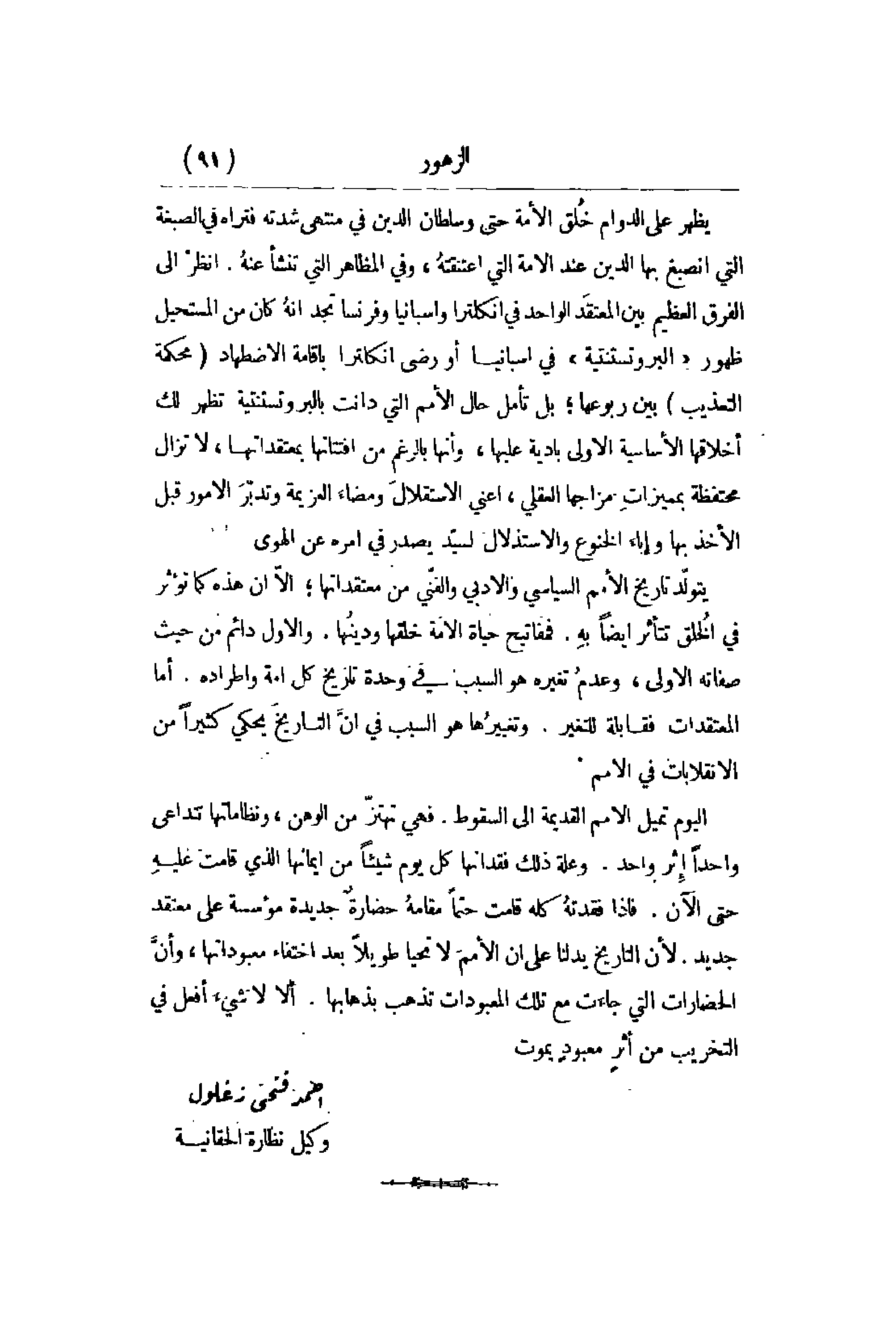 يظهر على الدوام خُلق الأمة حتى وسلطان الدين في منتهى شدته فتراه في الصبغة التي أنصبغ بها الدين عند الأمة التي اعتنقتهُ , وفي المظاهر التي تنشأ عنهُ. انظرْ إلى الفرق العظيم بين المعتقَد الواحد في انكلترا واسبانيا وفرنسا تجد أنهُ كان من المستحيل ظهور البروتستنتية في اسبانيا أو رضي انكلترا بإقامة الاضطهاد محكمة التعذيب بين ربوعها؛ ل تأمل حال الأمم التي دانت بالبروتستنتية تظهر لك أخلاقها الأساسية الأولى بادية عليها , وأنها بالرغم من افتتانها بمعتقداتها , لا تزال محتفظة بميزاتِ مزاجها العقلي , أعني الاستقلالَ ومضاءَ العزيمة وتدبّرَ الأمور قبل الأخذ بها وإباءَ الخنوع والاستذلالَ لسيّد يصدر في أمره عن الهوى. يتولّد تاريخ الأمم السياسي والأدبي والفّني من معتقداتها؛ إلاّ أن هذه كما تؤثر في الخُلق تتأثر أيضاًَ بهِ. فمفاتيح حياة الأمة خلقها ودينُها. والأول دائم من حيث صفاته الأولى , وعدمُ تغيره هو السبب في حدة تاريخ كل أمة واطراده. أما المعتقدات فقابلة للتغير. وتغييرُها هو السبب في أنَّ التاريخَ يحكي كثيراً من الانقلابات في الأمم. اليوم تميل الأمم القديمة على السقوط. فهي تهتزّ من الوهن , ونظاماتها تتداعى واحداً إثر واحد. وعلة ذلك فقدانها كل يوم شيئاً من إيمانها الذي قامت عليهِ حتى الآن. فإذا فقدتهُ كله قامت حتماً مقامهُ حضارةٌ جديدة مؤسسة على معتقد جديد. لأن التاريخ يدلنا على أن الأمم لا تحيا طويلاً بعد اختفاء معبوداتها , وأنَّ الحضارات التي جاءَت مع تلك المعبودات تذهب بذهابها. ألا لا شيءَ أفعل في التخريب من أثرٍ معبودٍ يموت.