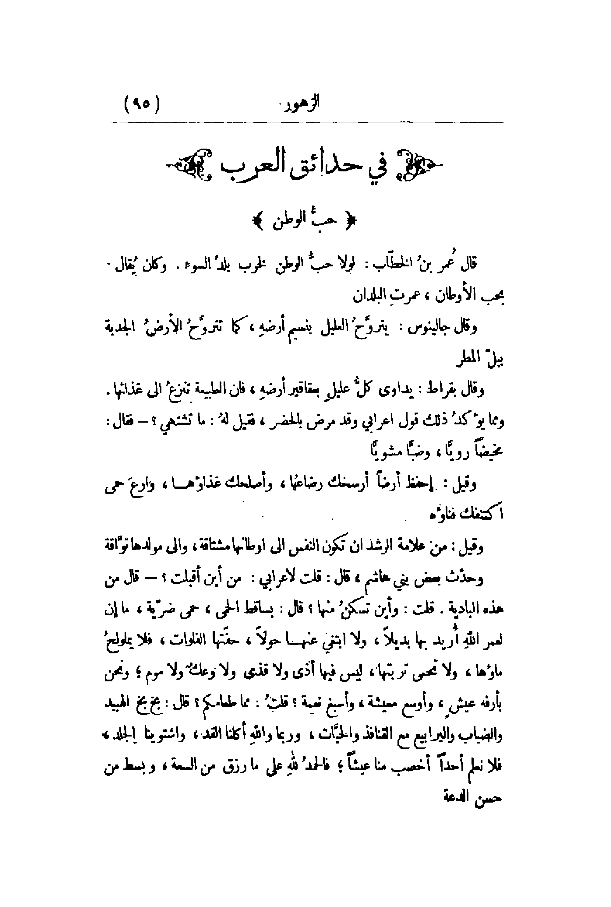 وقيل: من علامة الرشد أن تكون النفس إلى أوطانها مشتاقة , وإلى مولدها توَّاقة وحدّث بعض بين هاشم , قال: قلت لإعرابي: من أين أقبلت؟ - قال من هذه البادية. قلت: وأين تسكنُ منها؟ قال: بساقط الحمى , حمى ضرّية , ما إن لعمر اللهِ أُريد بها بديلاً , ولا ابتغي عنها حولاً , حفّتها الفلوات , فلا يملولحُ ماؤها , ولا تحمى تربتها , ليس فيها أذى ولا قذى ولا وعكٌ ولا موم؛ ونحن بأرفه عيشٍ , وأوسع معيشة , وأسبغ نعمة؟ قلتُ: مما طعامكم؟ قال: بخ بخ الهبيد والضباب والبرابيع مع القنافذ والحيَّات , وربما واللهِ أكلنا القد , واشتوينا الجلد , فلا نعلم أحداً أخصب منا عيشاً؛ فالحمدُ للهِ على ما رزق من السعة , وبسط من حسن الدعة.