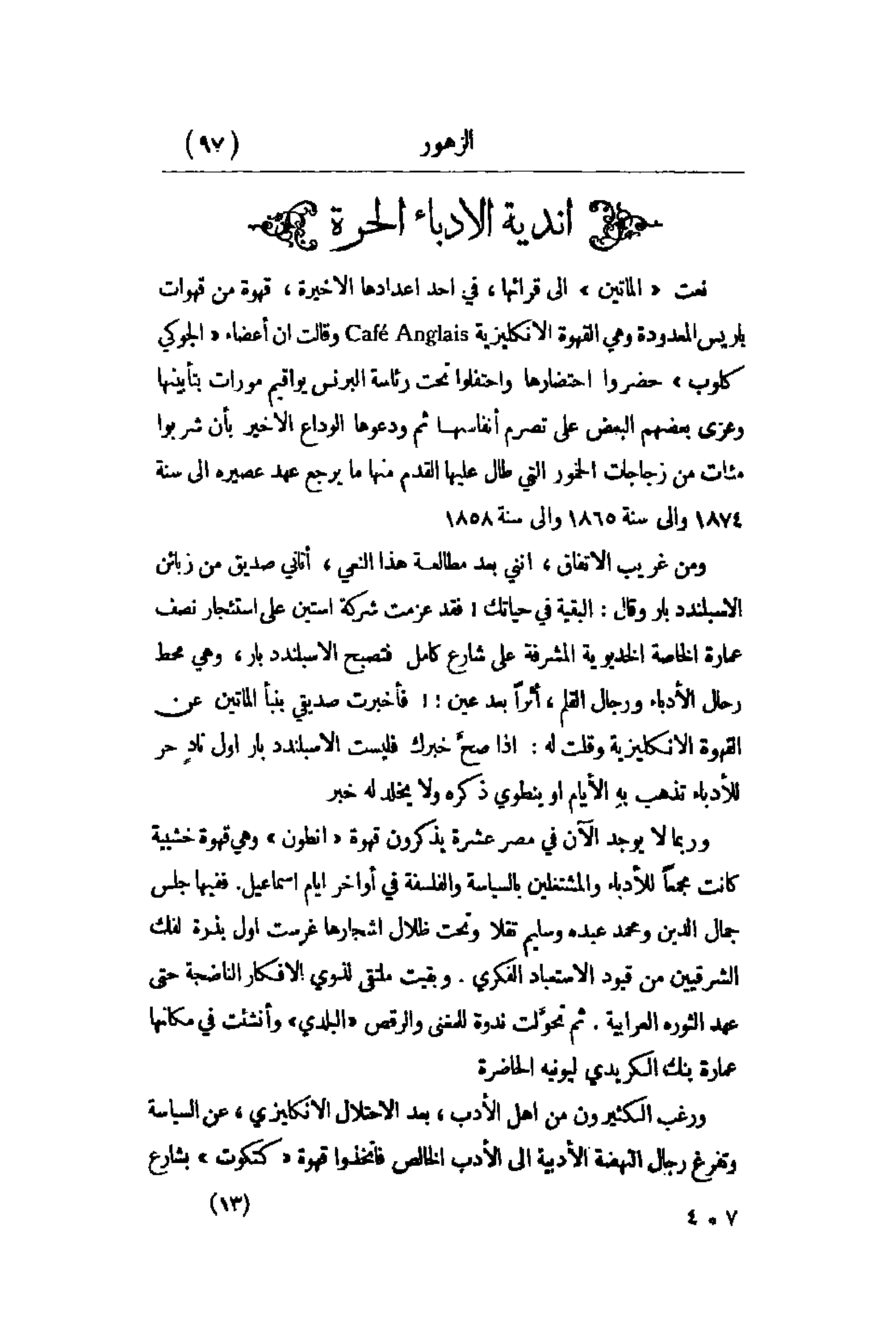 نعت الماتين إلى قرائها , في أحد أعدادها الأخيرة , قهوة من قهوات باريس المعدودة وهي القهوة الانكليزية وقالت أن أعضاء الجوكي كلوب حضروا احتضارها واحتفلوا تحت رئاسة البرنس يواقيم مورات بتابيتها وعزى بعضهم البعض على تصرم أنفاسها ثم ودعوها الوداع الأخير بأن شربوا مئات من زجاجات الخمور التي طال عليها القدم منها ما يرجع عهد عصيره إلى سنة1874 وإلى سنة 1865 وإلى سنة 1858. ومن غريب الاتفاق , أنني بعد مطالعة هذا النعي , أتاني صديق من زبائن الاسبلندد بار وقال: البقية في حياتك! فقد عزمت شركة استين على استئجار نصف عمارة الخاصة الخديوية المشرقة على شارع كامل فتصبح الاسبلندد بار , وهي محط رحال الأدباء ورجال القلم , أثراً بعد عين!! فأخبرت صديقي بنبأ الماتين عن القهوة الانكليزية وقلت له: إذا صحَّ خبرك فليست الاسبلدد بار أول نادٍ حر للأدباء تذهب بهِ الأيام أو ينطوي ذكره ولا يخلد له خبر. وربما لا يوجد الآن في مصر عشرة يذكرون قهوة انطون وهي قهوة خشية كانت مجمعاً للأدباء والمشتغلين بالسياسة والفلسفة في أواخر أيام إسماعيل. ففيها جلس جمال الدين ومحمد عبده وسليم تقلا وتحت ظلال أشجارها غرست أول بذرة لفك الشرقيين من قيود الاستعباد الفكري. وبقيت ملتقى لذوي الأفكار الناضجة حتى عهد الثورة العرابية. ثم تحوَّلت ندوة للمغنى والرقص البلدي وأنشئت في مكانها عمارة بنك الكريدي ليونيه الحاضرة. ورغب الكثيرون من أهل الأدب , بعد الاحتلال الانكليزي , عن السياسة وتفرغ رجال النهضة الأدبية إلى الأدب الخالص فاتخذوا قهوة كتكوت بشارع