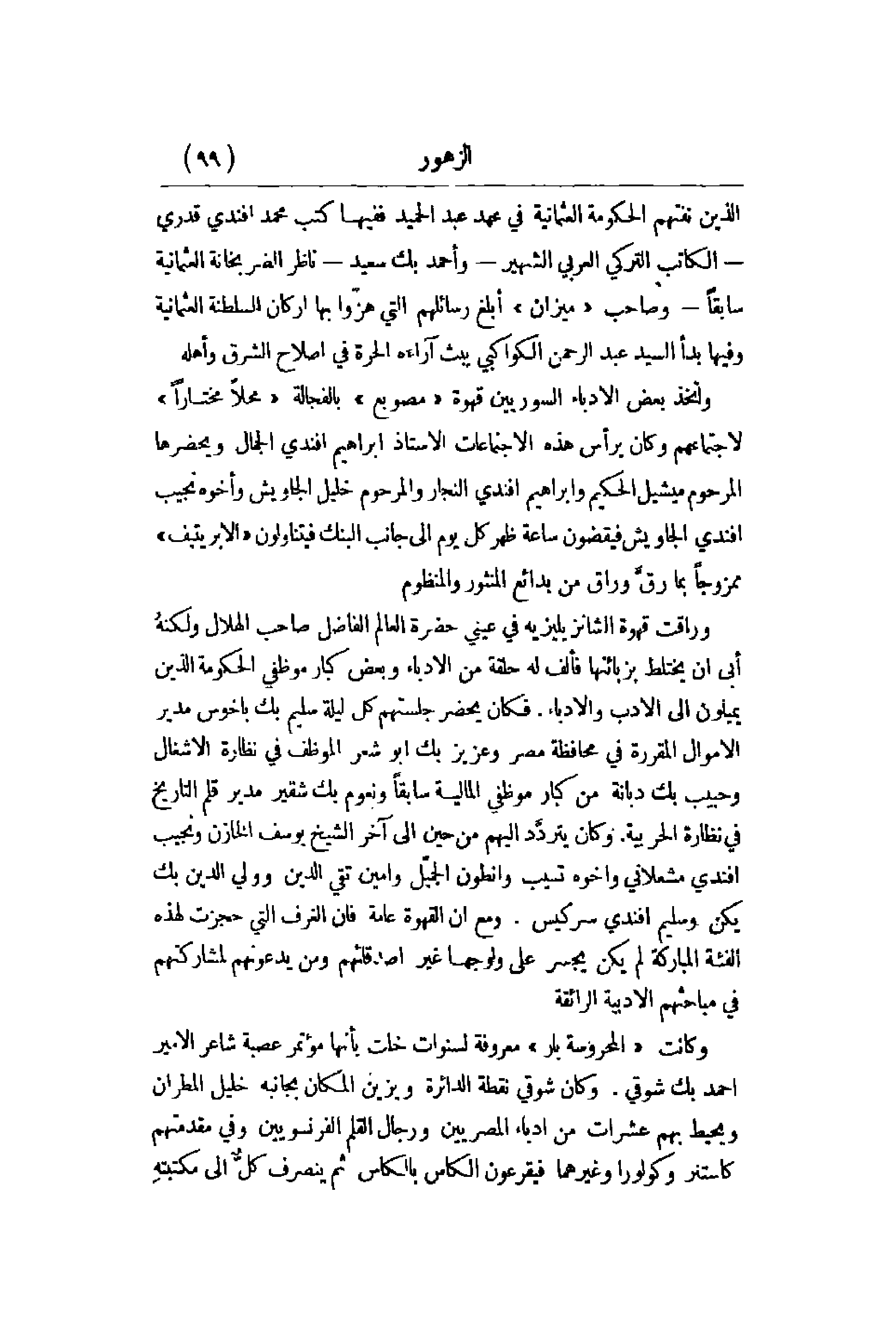 الذين نفتهم الحكومة العثمانية في عهد عبد الحميد ففيها كتب محمد أفندي قدري - الكاتب التركي العربي الشهير - وأحمد بك سيد - ناظر الضربخانة العثمانية سابقاً - وصاحب ميزان أبلغ رسائلهم التي هزّوا بها أركان السلطنة العثمانية وفيها بدأ السيد عبد الرحمن الكواكبي يبث آراءه الحرة في إصلاح الشرق وأهله. واتخذ بعض الأدباء السوريين قهوة مصوبع بالفجالة محلاً مختاراً لاجتماعهم وكان يرأس هذه الاجتماعات الأستاذ إبراهيم أفندي الجمال ويحضرها المرحوم ميشيل الحكيم وإبراهيم أفندي النجار والمرحوم خليل الجاويش وأخوه نجيب أفندي الجاويش فيقصون ساعة ظهر كل يوم إلى جانب البنك فيتناولون الابريتيف ممزوجاً بما رقَّ وراق من بدائع المنثور والمنظوم. وراقت قهوة الشانزيليزيه في عيني حضرة العالم الفاضل صاحب الهلال ولكنهُ أبي أن يختلط بزبائنها فألف له حلقة من الأدباء وبعض كبار موظفي الحكومة الذين يميلون إلى الأدب والأدباء. فكان يحضر جلستهم كل ليلة سليم بك باخوس مدير الأموال المقررة في محافظة مصر وعزيز بك أبو شعر الموظف في نظارة الأشغال وحبيب بك دبانة من كبار موظفي المالية سابقاً ونعوم بك شقير مدير قلم التاريخ في نظارة الحربية. وكان يتردَّد إليهم من حين إلى آخر الشيخ يوسف الخازن ونجيب أفندي مشعلاني وأخوه تسيب وأنطوان