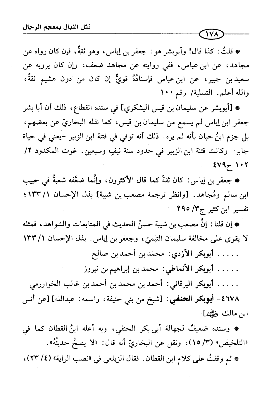 * جعفر بن إياس: كان ثقةً كما قال الأكثرون، وإنَّما ضعَّفه شعبةُ في حبيب ابن سالم ومُجاهد. [وانظر ترجمة مصعب بن شيبة] بذل الإحسان 1/ 133؛ تفسير ابن كثير ج 3/ 295