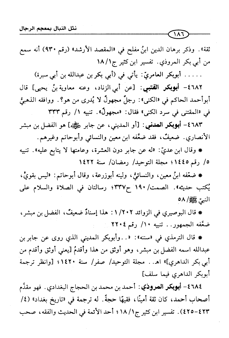 4682 - أبو بكر القتبي: [عن أبي الزناد، وعنه معاوية بنُ يحيى] قال أبو أحمد الحاكم في "الكني": رجلٌ مجهولٌ لا يُدرى من هو؟. ووافقه الذهبيُّ في "المقتنى في سرد الكني" فقال: "مجهولٌ". تنبيه 1/ رقم 333