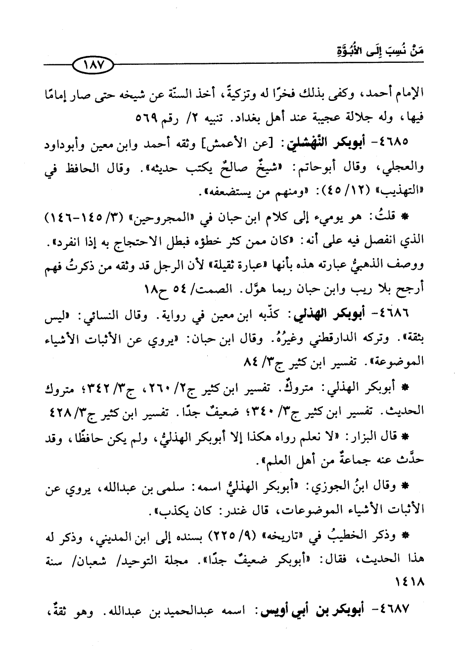 4686 - أبو بكر الهذلي: كذّبه ابن معين في رواية. وقال النسائي: "ليس بثقة". وتركه الدارقطني وغير. وقال ابن حبان: في روي عن الإثبات الأشياء الموضوعة". تفسير ابن كثير ج 3/ 84