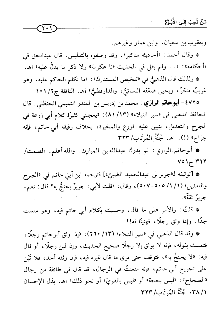 4725 - أبو حاتم الرازي: محمَّد بن إدريس بن المنذر التميمي الحنظلي. قال الحافظ الذهبي في "سير النبلاء" (13/ 81): "يعجبني كثيرًا كلام أبي زرعة في "الجرح والتعديل" يتبين عليه الورع والمخبرة، بخلاف رفيقه أبي حاتم، فإنه جراح (!). اهـ. جُنَّةُ المُرتَاب / 323