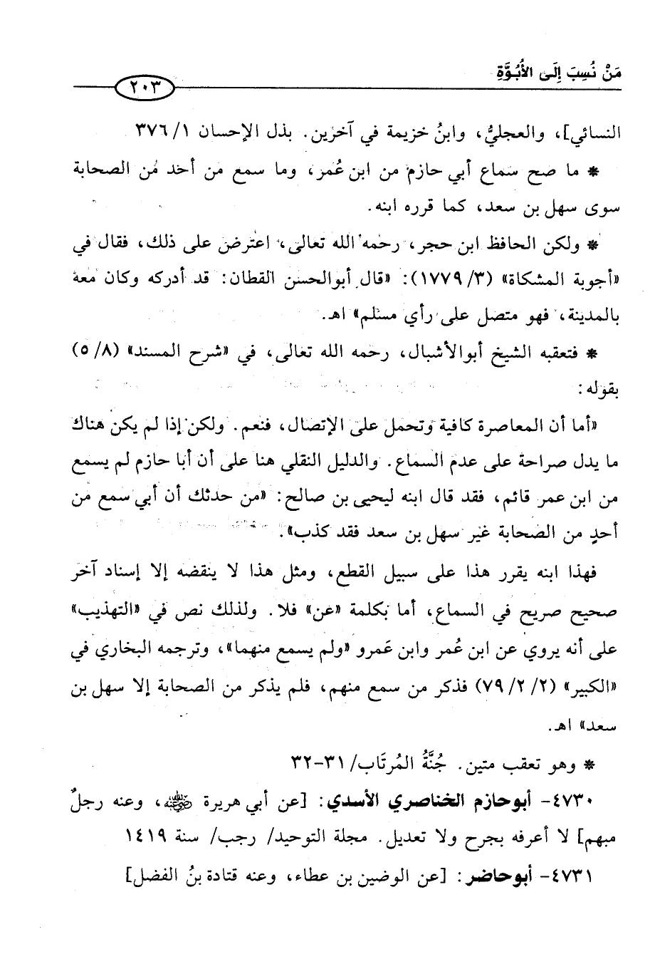 * فتعقبه الشيخ أبو الأشبال، رحمه الله تعالى، في "شرح المسند" (8/ 5) بقوله: "أما أن المعاصرة كافية وتحمل على الإتصال، فنعم. ولكن إذا لم يكن هناك ما يدل صراحة على عدم السماع. والدليل النقلي هنا على أن أبا حازم لم يسمع من ابن عمر قائم، فقد قال ابنه ليحيى بن صالح: "من حدثك أن أبي سمع من أحدٍ من الصحابة غير سهل بن سعد فقد كذب". فهذا ابنه يقرر هذا على سبيل القطع، ومثل هذا لا ينقضه إلا إسناد آخر صحيح صريح في السماع، أما بكلمة "عن" فلا. ولذلك نص في "التهذيب" على أنه يروي عن ابن عُمر وابن عَمرو "ولم يسمع منهما"، وترجمه البخاري في "الكبير" (2/ 2/ 79) فذكر من سمع منهم، فلم يذكر من الصحابة إلا سهل بن سعد" اهـ.