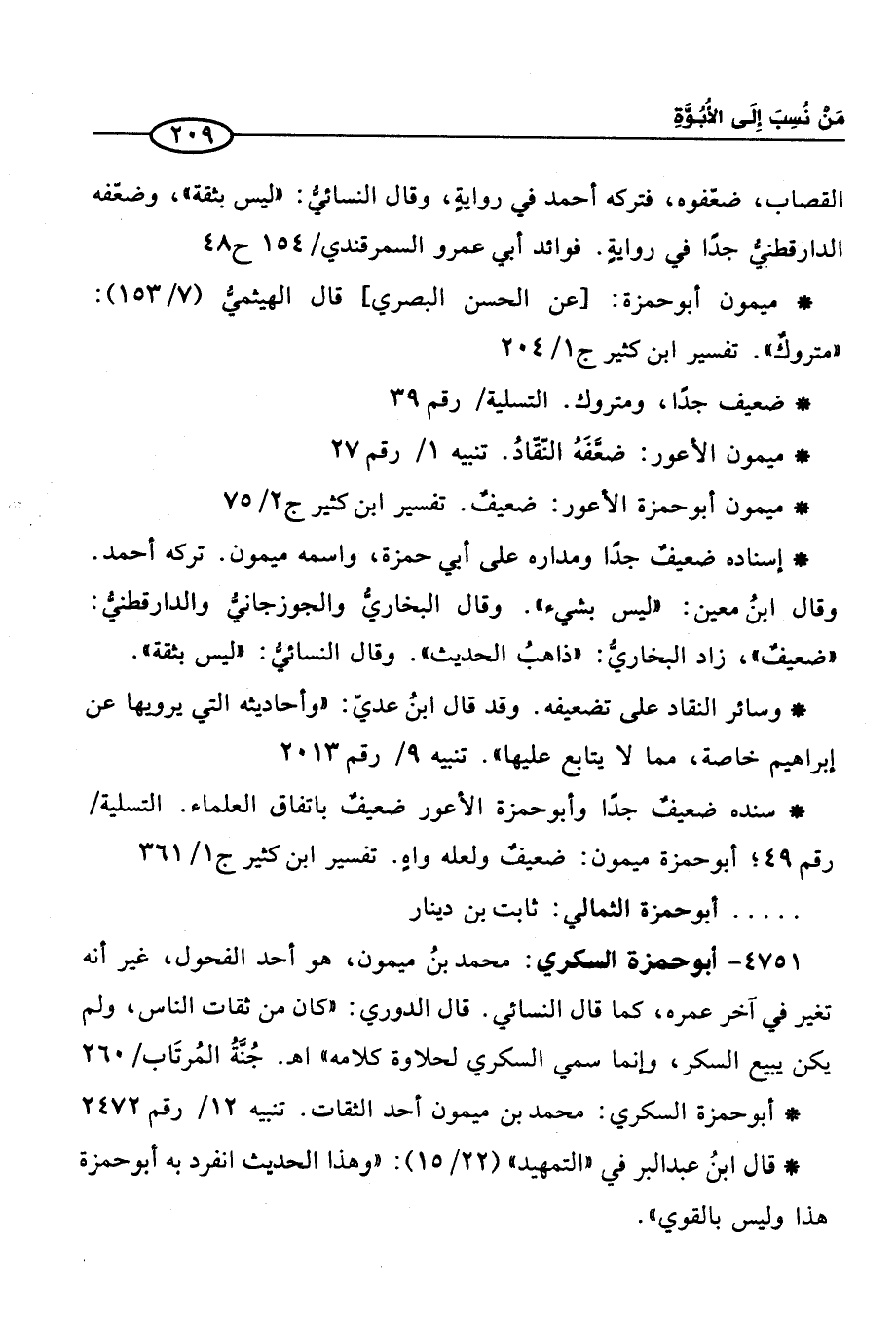 4751 - أبو حمزة السكري: محمد بنُ ميمون، هو أحد الفحول، غير أنه تغير في آخر عمره، كما قال النسائي. قال الدوري: "كان من ثقات الناس، ولم يكن يبيع السكر، وإنما سمي السكري لحلاوة كلامه" اهـ. جُنَةُ المُرتَاب / 260