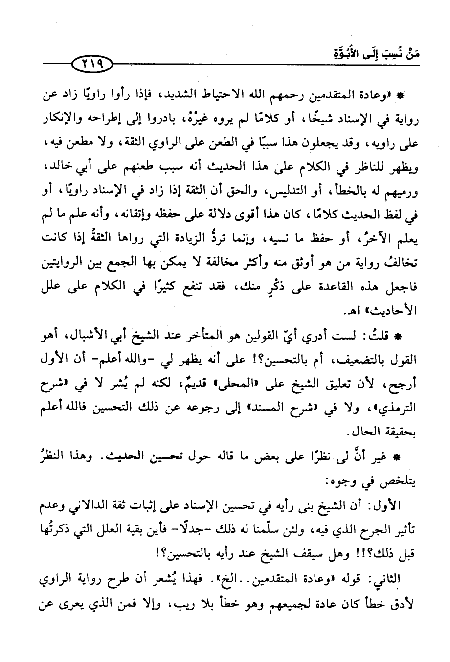 * غير أنَّ لي نظرًا على بعض ما قاله حول تحسين الحديث. وهذا النظرُ يتلخص في وجوه: الأول: أن الشيخ بنى رأيه في تحسين الإسناد على إثبات ثقة الدالاني وعدم تأثير الجرح الذي فيه، ولئن سلّمنا له ذلك -جدلًا- فأين بقية العلل التي ذكرتُها قبل ذلك؟!! وهل سيقف الشيخ عند رأيه بالتحسين؟! الثاني: قوله وعادة المتقدمين. . الخ ". فهذا يُشعر أن طرح رواية الراوي لأدق خطأ كان عادة لجميعهم وهو خطأ بلا ريب، وإلا فمن الذي يعرى عن