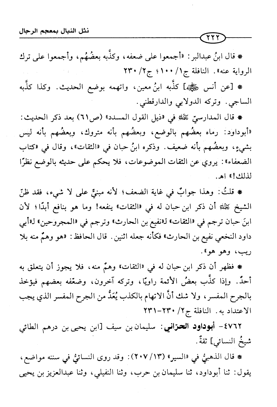 * فظهر أن ذكر ابن حبان له في "الثقات" وهمٌ منه، فلا يجوز أن يتعلق به أحدٌ. وإذا كذَّب بعضُ الأئمة راويًا، وتركه آخرون، وضعّفه بعضهم فيؤخذ بالجرح المفسر، ولا شك أنَّ الاتهام بالكذب يُعَدُّ من الجرح المفسر الذي يجب الاعتداد به. النافلة ج 2/ 230 - 231