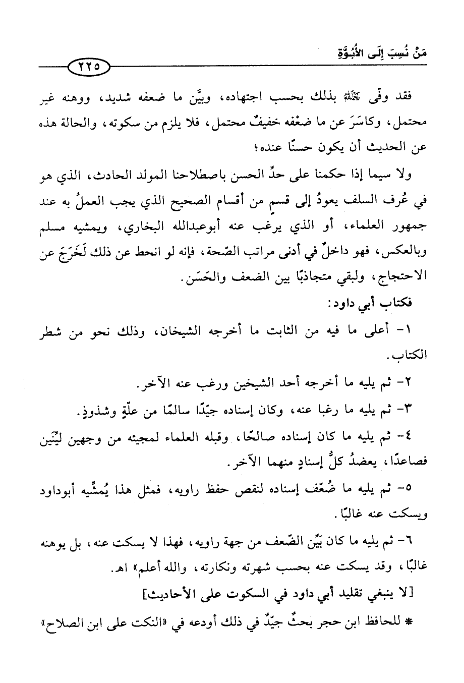 ولا سيما إذا حكمنا على حدِّ الحسن باصطلاحنا المولد الحادث، الذي هو في عُرف السلف يعودُ إلى قسمٍ من أقسام الصحيح الذي يجب العملُ به عند جمهور العلماء، أو الذي يرغب عنه أبو عبد الله البخاري، ويمشيه مسلم وبالعكس، فهو داخل في أدنى مراتب الصّحة، فإنه لو انحط عن ذلك لَخَرَجَ عن الاحتجاج، ولبقي متجاذبًا بين الضعف والحُسْن. فكتاب أبي داود: