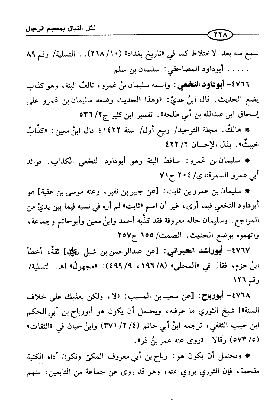 4767 - أبو راشد الحبراني: [عن عبد الرحمن بن شبل -رَضِيَ الله عَنْهُ-] ثقة، أخطأ ابنُ حزم، فقال في "المحلى" (8/ 196، 9/ 499): "مجهولٌ" اهـ. التسلية / رقم 126.
