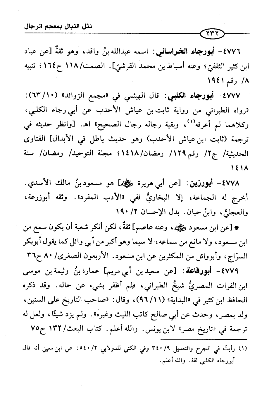 4776 - أبو رجاء الخراساني: اسمه عبد الله بنُ واقد، وهو ثقةٌ [عن عباد ابن كثير الثقفيّ؛ وعنه أسباط بن محمَّد القرشيّ]. الصمت / 118 ح 164؛ تنبيه 8/ رقم 1941