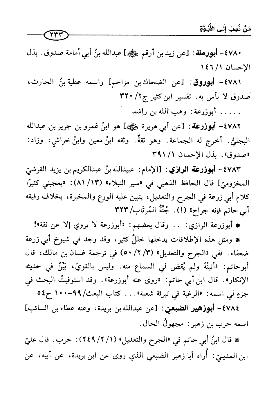 4783 - أبو زرعة الرازي: [الإمام: عبيد الله بنُ عبد الكريم بن يزيد القرشيّ المخزوميّ] قال الحافظ الذهبي في "سير النبلاء" (13/ 81): "يعجبني كثيرًا كلام أبي زرعة في الجرح والتعديل, يتبين عليه الورع والمخبرة، بخلاف رفيقه أبي حاتم فإنه جراح" (!). جُنَّةُ المُرتَاب / 323