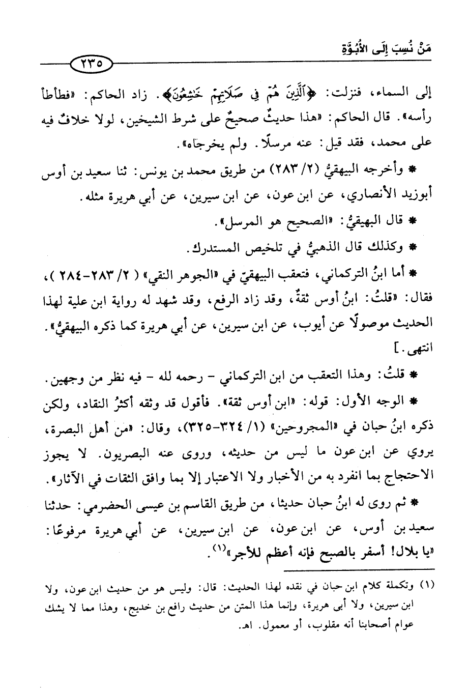 (1) وتكملة كلام ابن حبان في نقده لهذا الحديث: قال: وليس هو من حديث ابن عون، ولا ابن سيرين، ولا أبى هريرة، وإنما هذا المتن من حديث رافع بن خديج، وهذا مما لا يشك عوام أصحابنا أنه مقلوب، أو معمول. اهـ.