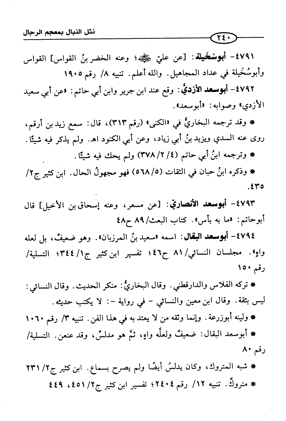 4794 - أبو سعد البقال: اسمه "سعيد بنُ المرزبان". وهو ضعيفٌ، بل لعله واهٍ". مجلسان النسائي / 81 ح 46؛ تفسير ابن كثير ج 1/ 344؛ التسلية / رقم 150