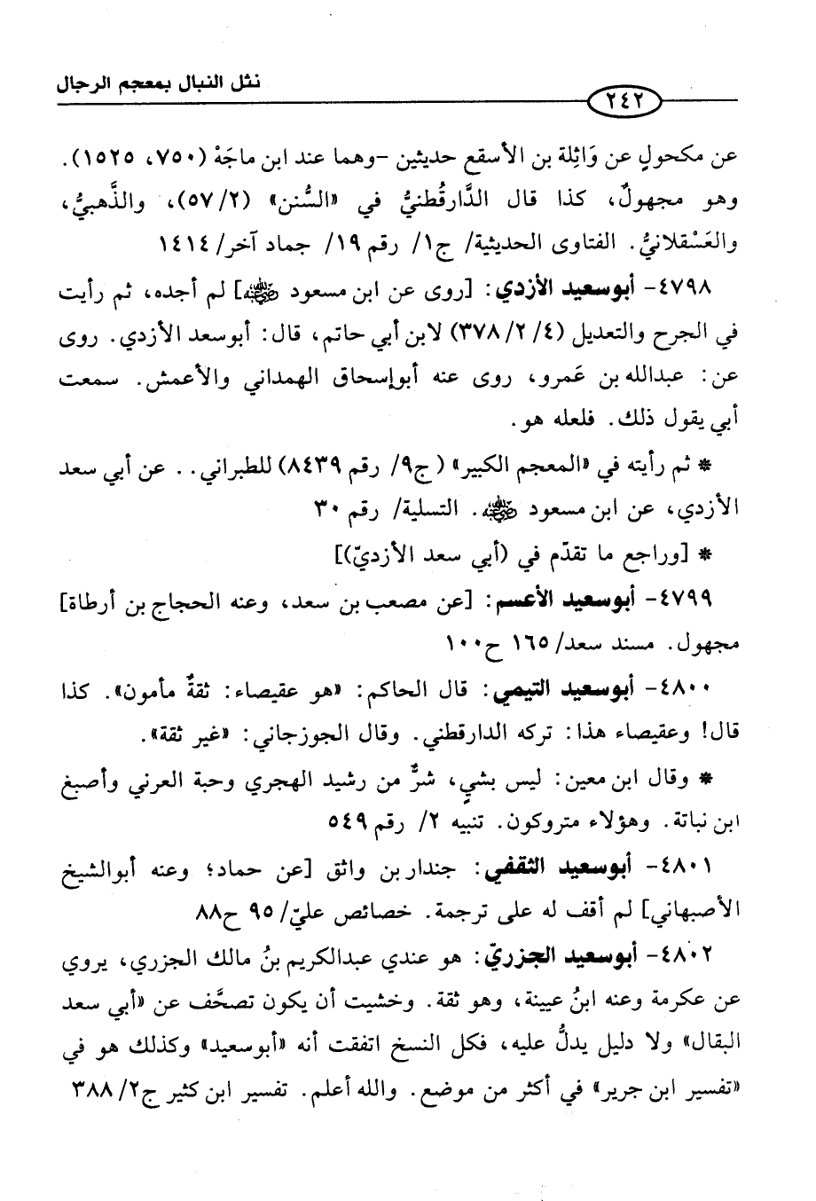 4802 - أبو سعيد الجزريّ: هو عندي عبد الكريم بنُ مالك الجزري، يروي عن عكرمة وعنه ابنُ عيينة، وهو ثقة. وخشيت أن يكون تصحَّف عن "أبي سعد البقال" ولا دليل يدلُّ عليه، فكل النسخ اتفقت أنه "أبو سعيد" وكذلك هو في "تفسير ابن جرير" في أكثر من موضع. والله أعلم. تفسير ابن كثير ج 2/ 388