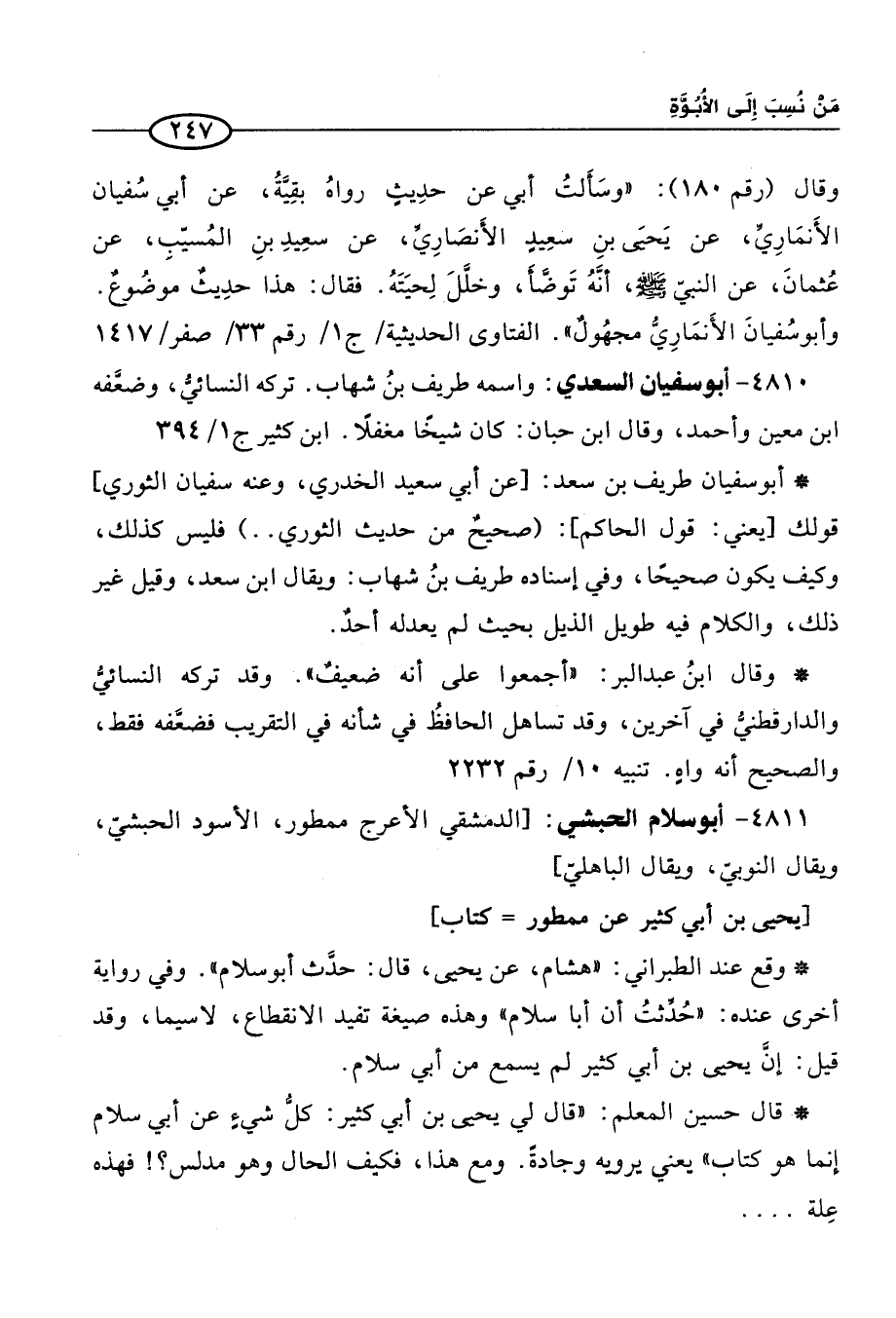 4810 - أبو سفيان السعدي: واسمه طريف بنُ شهاب. تركه النسائيُّ، وضعَّفه ابن معين وأحمد، وقال ابن حبان: كان شيخًا مغفلًا. ابن كثير ج 1/ 394