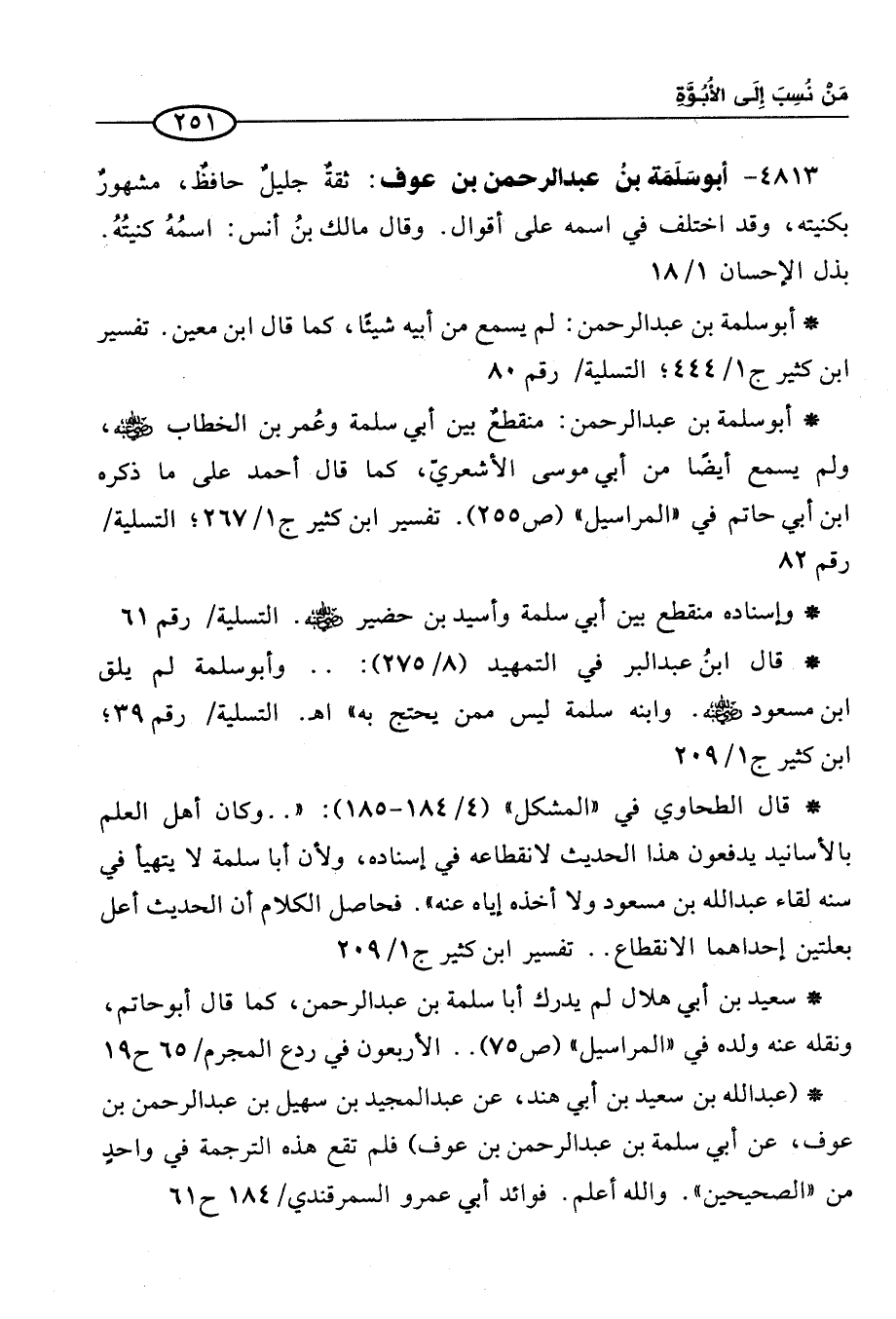 4813 - أبو سَلَمة بنُ عبد الرحمن بن عوف: ثقةٌ جليلٌ حافظٌ، مشهورٌ بكنيته، وقد اختلف في اسمه على أقوال. وقال مالك بنُ أنس: اسمُهُ كنيتُهُ. بذل الإحسان 1/ 18