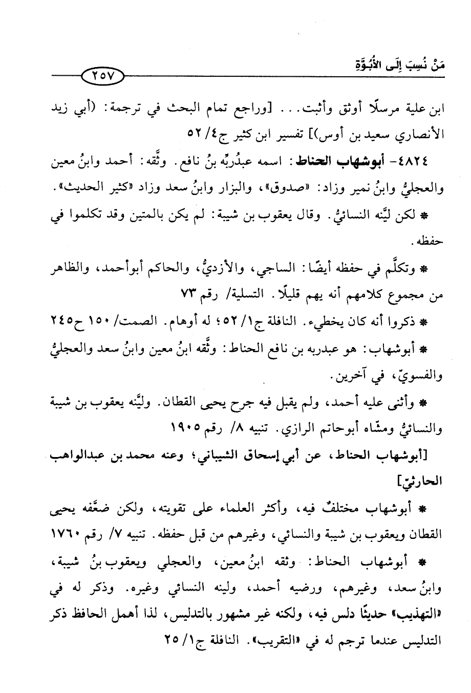* أبو شهاب الحناط: وثقه ابنُ معين، والعجلي ويعقوب بنُ شيبة، وابن سعد، وغيرهم، ورضيه أحمد، ولينه النسائي وغيره. وذكر له في "التهذيب" حديثًا دلس فيه، ولكنه غير مشهور بالتدليس، لذا أهمل الحافظ ذكر التدليس عندما ترجم له في "التقريب". النافلة ج 1/ 25