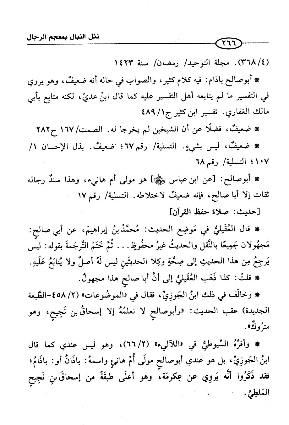 * أبو صالح: [عن ابن عباس -رَضِيَ الله عَنْهُ-] هو مولى أم هانيء، وهذا سندٌ رجاله ثقات إلا أبا صالح، فإنه ضعيفٌ لاختلاطه. التسلية / رقم 17