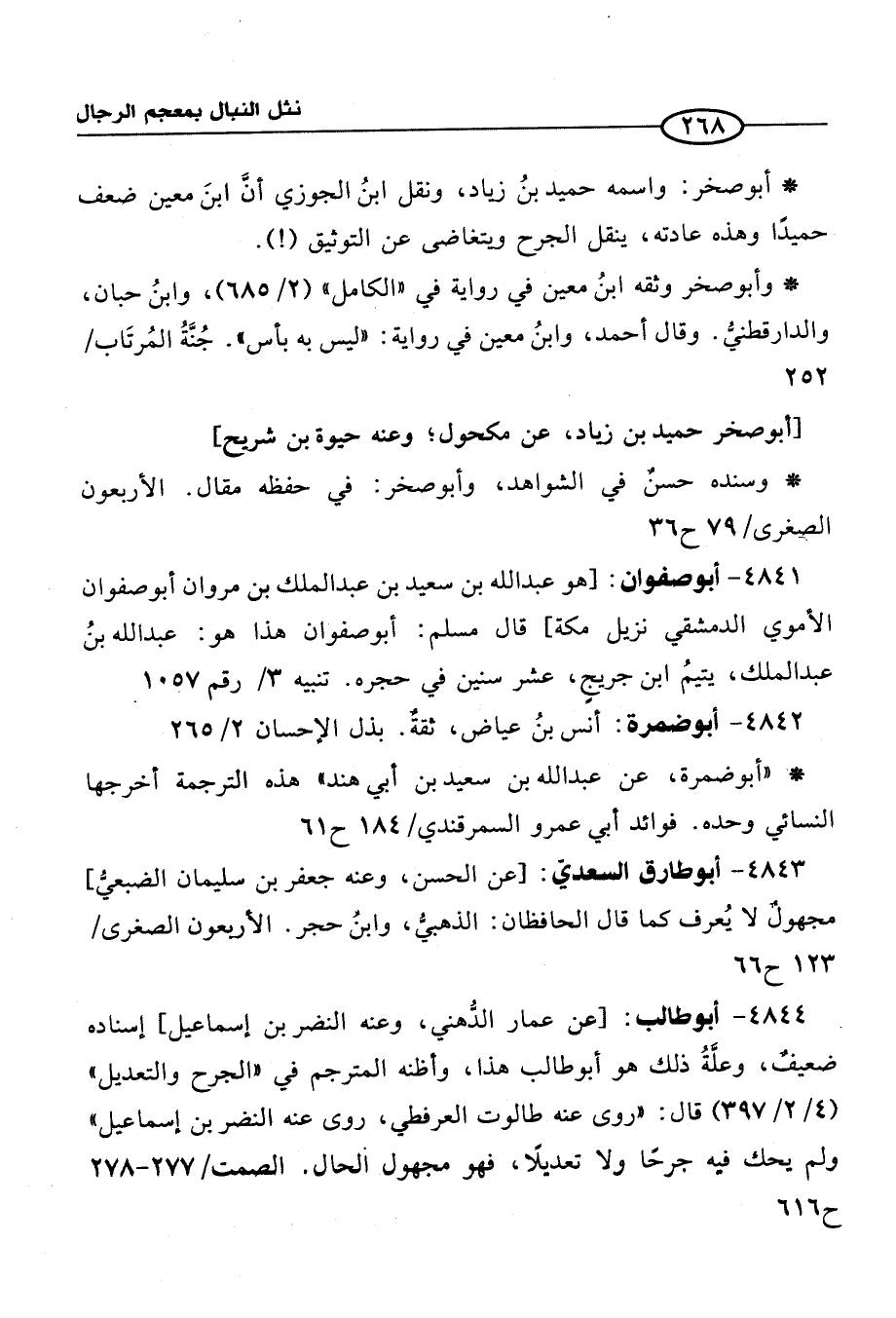 4843 - أبو طارق السعديّ: [عن الحسن، وعنه جعفر بن سليمان الضبعيُّ] مجهولٌ لا يُعرف كما قال الحافظان: الذهبيُّ، وابن حجر. الأربعون الصغرى / 123ح 66