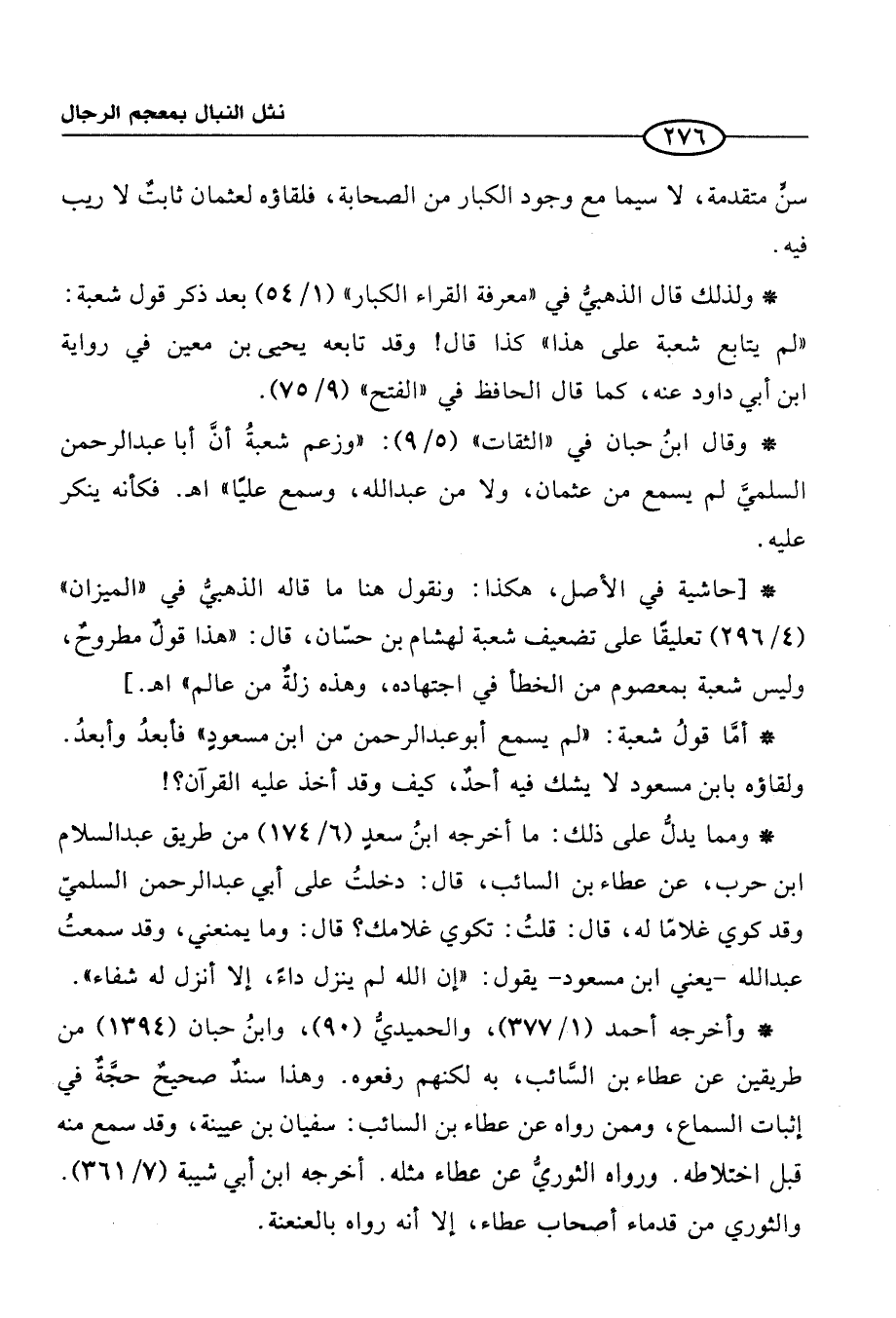* أمَّا قولُ شعبة: "لم يسمع أبو عبد الرحمن من ابن مسعود" فأبعدُ وأبعدُ. ولقاؤه بابن مسعود لا يشك فيه أحدٌ، كيف وقد أخذ عليه القرآن؟!