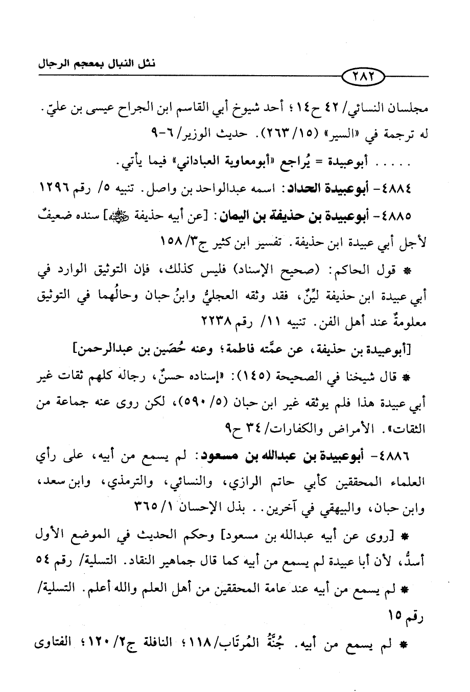 4886 - أبو عبيدة بن عبد الله بن مسعود: لم يسمع من أبيه، على رأي العلماء المحققين كأبي حاتم الرازي، والنسائي، والترمذي، وابن سعد، وابن حبان، والبيهقي في آخرين. . بذل الإحسان 1/ 365