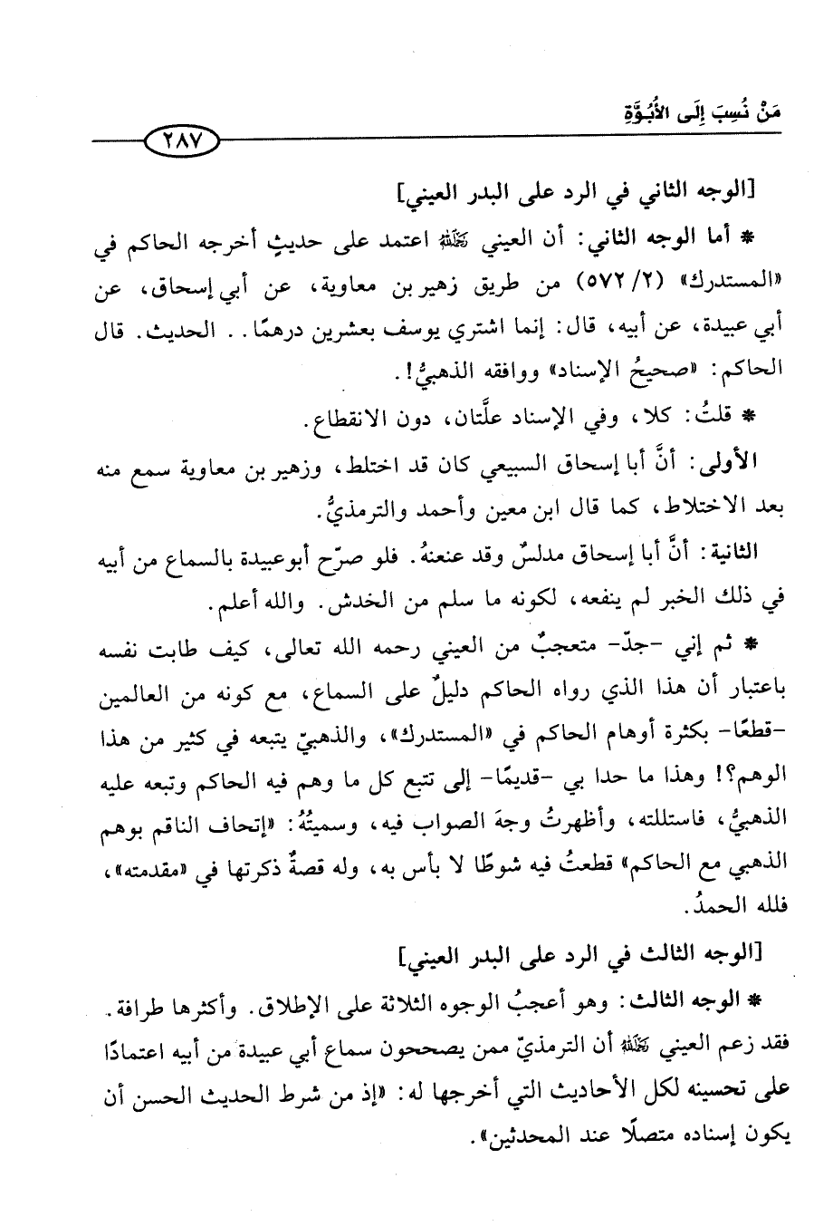 * الوجه الثالث: وهو أعجبُ الوجوه الثلاثة على الإطلاق. وأكثرها طرافة. فقد زعم العيني رحمه الله أن الترمذيّ ممن يصححون سماع أبي عبيدة من أبيه اعتمادًا على تحسينه لكل الأحاديث التي أخرجها له: "إذ من شرط الحديث الحسن أن يكون إسناده متصلًا عند المحدثين".