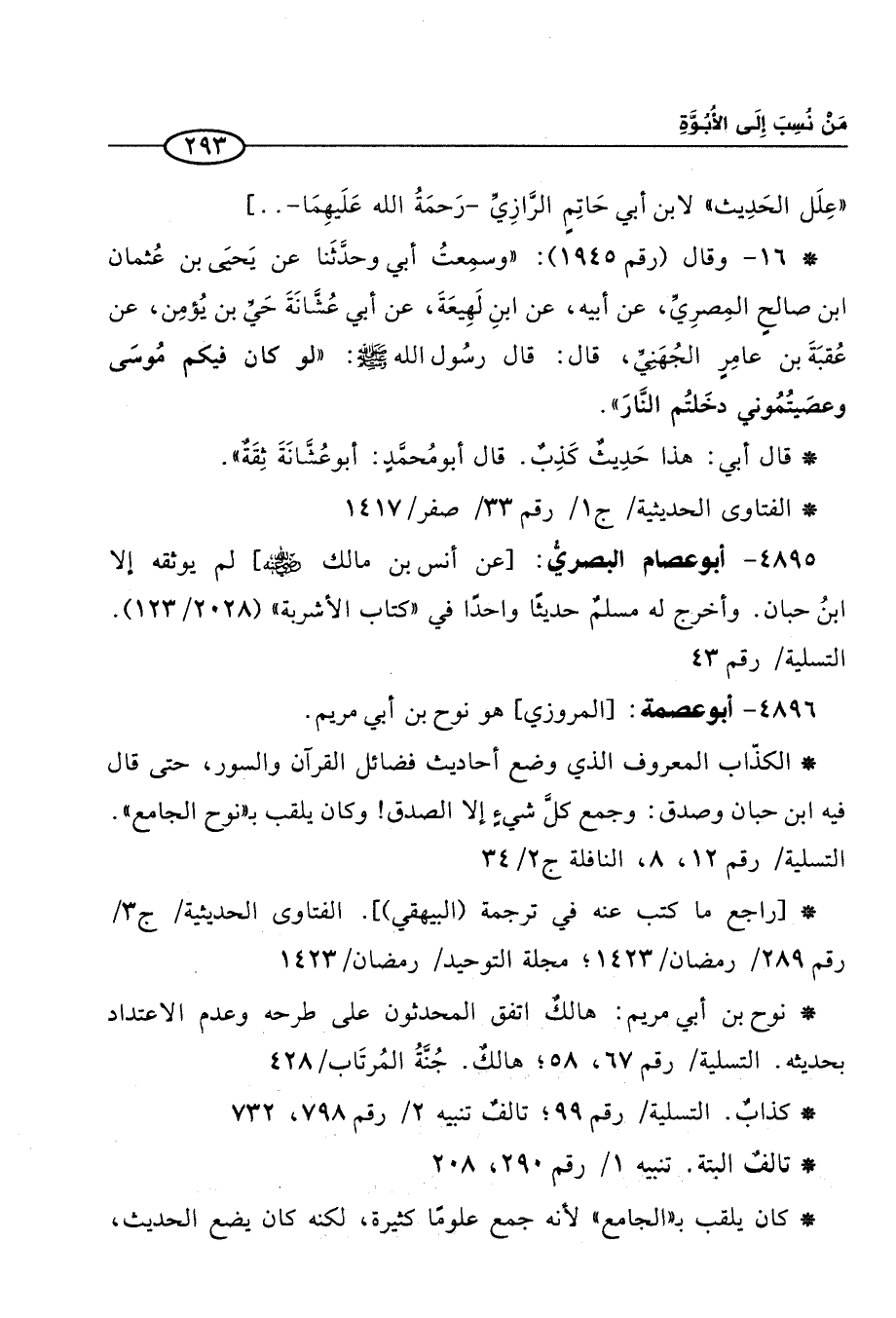 * 16 - وقال (رقم 1945): "وسمِعتُ أبي وحدَّثَنا عن يَحيَى بن عُثمان ابن صالحٍ المِصرِيِّ، عن أبيه، عن ابنِ لَهِيعَةَ، عن أبي عُشَّانَةَ حَيِّ بن يُؤمِن، عن عُقبَةَ بن عامِرٍ الجُهَنِيِّ، قال: قال رسُول الله -صلى الله عليه وسلم-: "لو كان فيكم مُوسَى وعصَيتُمُوني دخَلتُم النَّارَ".