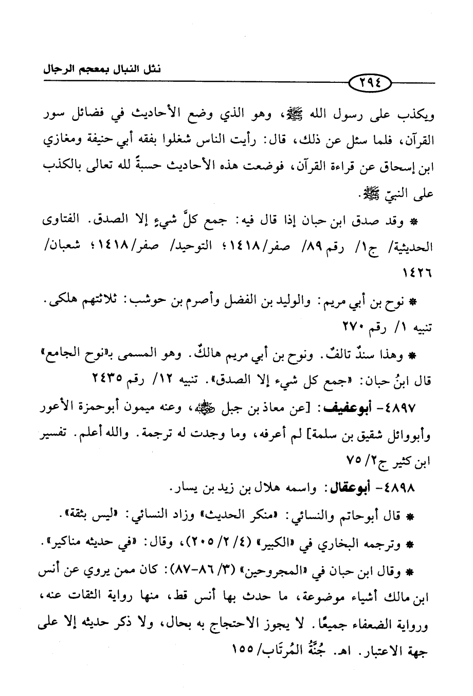 *وقد صدق ابن حبان إذا قال فية: جمع كلَّ شيءٍ إلا الصدق. الفتاوى الحديثية / ج 1/ رقم 89/ صفر / 1418؛ التوحيد / صفر / 1418؛ شعبان / 1426