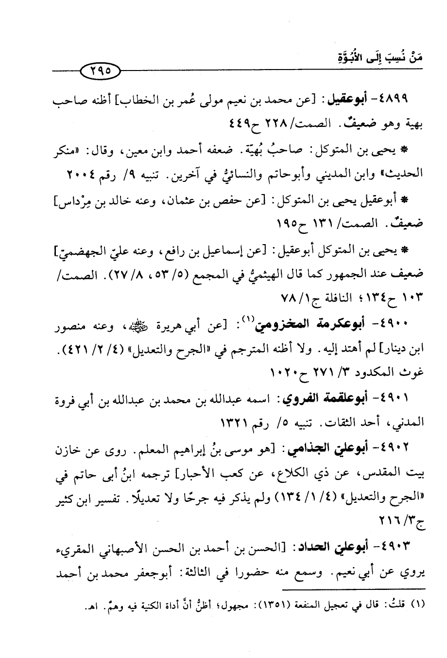 4902 - أبو عليّ الجذامي: [هو موسى بنُ إبراهيم المعلم. روى عن خازن بيت المقدس، عن ذي الكلاع، عن كعب الأحبار] ترجمه ابنُ أبى حاتم في "الجرح والتعديل" (4/ 1/ 134) ولم يذكر فيه جرحًا ولا تعديلًا. تفسير ابن كثير ج 3/ 216