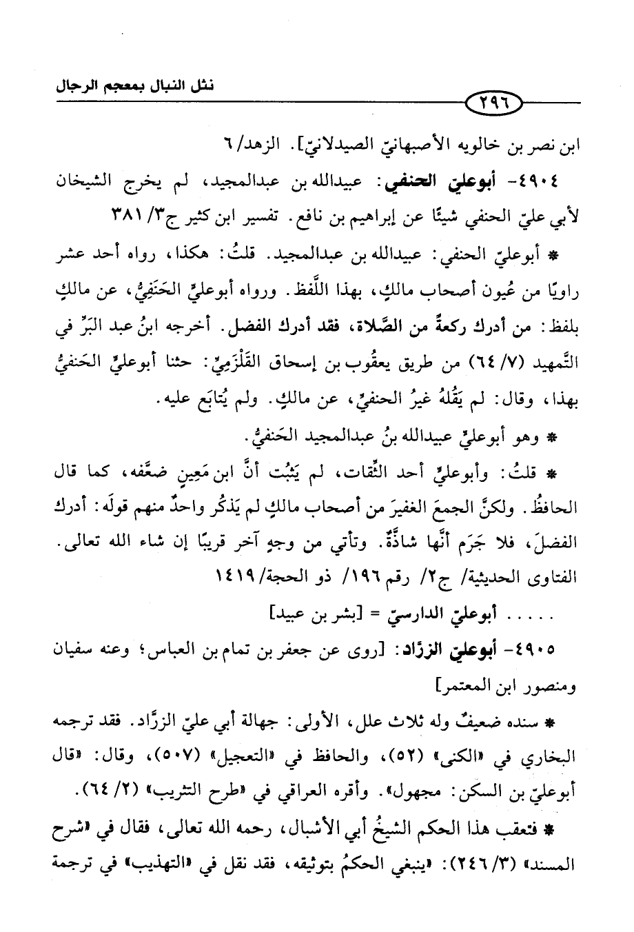 4904 - أبو عليّ الحنفي: عبيد الله بن عبد المجيد، لم يخرج الشيخان لأبي عليّ الحنفي شيئًا عن إبراهيم بن نافع. تفسير ابن كثير ج 3/ 381