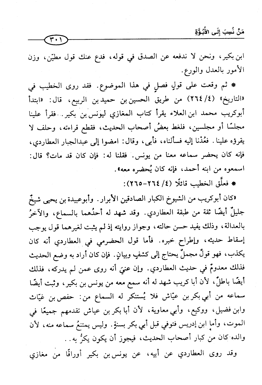 * ثم وقعت على قولٍ فصلٍ في هذا الموضوع. فقد روى الخطيب في "التاريخ" (4/ 264) من طريق الحسين بن حميد بن الربيع، قال: "ابتدأ أبو كريب محمد ابن العلاء يقرأ كتاب المغازي ليونس بن بكير. فقرأ علينا مجلسًا أو مجلسين، فلغط بعضُ أصحاب الحديث، فقطع قراءته، وحلف لا يقرؤه علينا. فعُدْنا إليه فسألناه، فأبى، وقال: امضوا إلى عبد الجبار العطاردي، فإنه كان يحضر سماعه معنا من يونس. فقلنا له: فإن كان قد مات؟ قال: اسمعوه من ابنه أحمد، فإنه كان يُحضره معه".