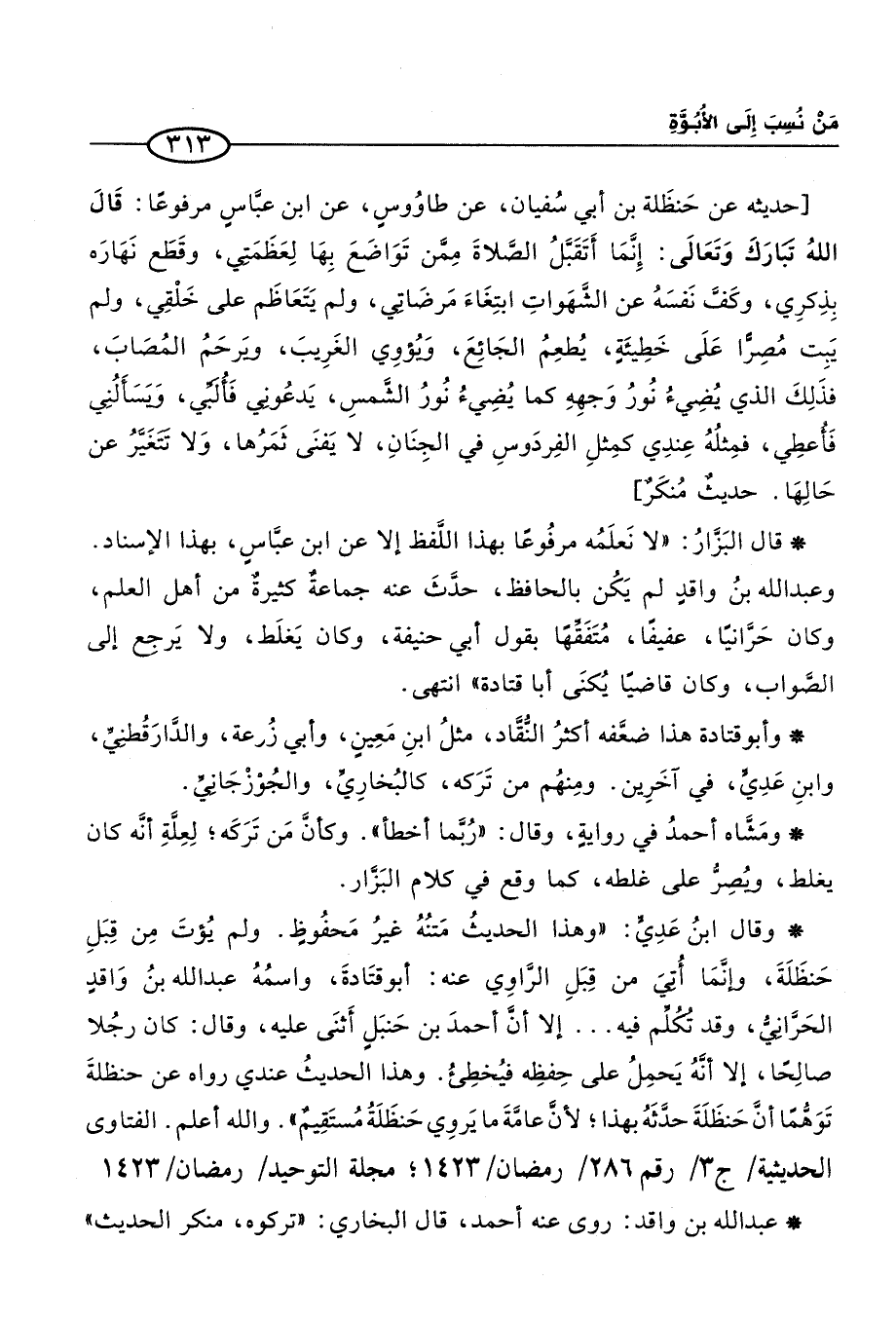 * وقال ابنُ عَدِيِّ: "وهذا الحديثُ مَتنُهُ غيرُ مَحفُوظٍ. ولم يُؤتَ مِن قِبَلِ حَنظَلَةَ، وإنَّمَا أُتِيَ من قِبَلِ الرَّاوِي عنه: أبو قتَادةَ، واسمُهُ عبد الله بنُ وَاقدٍ الحَرَّانِيُّ، وقد تُكُلِّم فيه. . . إلا أنَّ أحمدَ بن حَنبَلٍ أَثنَى عليه، وقال: كان رجُلًا صالِحًا، إلا أنَّهُ يَحمِلُ على حِفظِه فيُخطِئُ. وهذا الحديثُ عندي رواه عن حنظلةَ تَوَهُّمًا أنَّ حَنظَلَةَ حدَّثَهُ بهذا؛ لأنَّ عامَّةَ ما يَروِي حَنظَلَةُ مُستَقِيمٌ". والله أعلم. الفتاوى الحديثية / ج 3/ رقم 286/ رمضان / 1423؛ مجلة التوحيد / رمضان / 1423