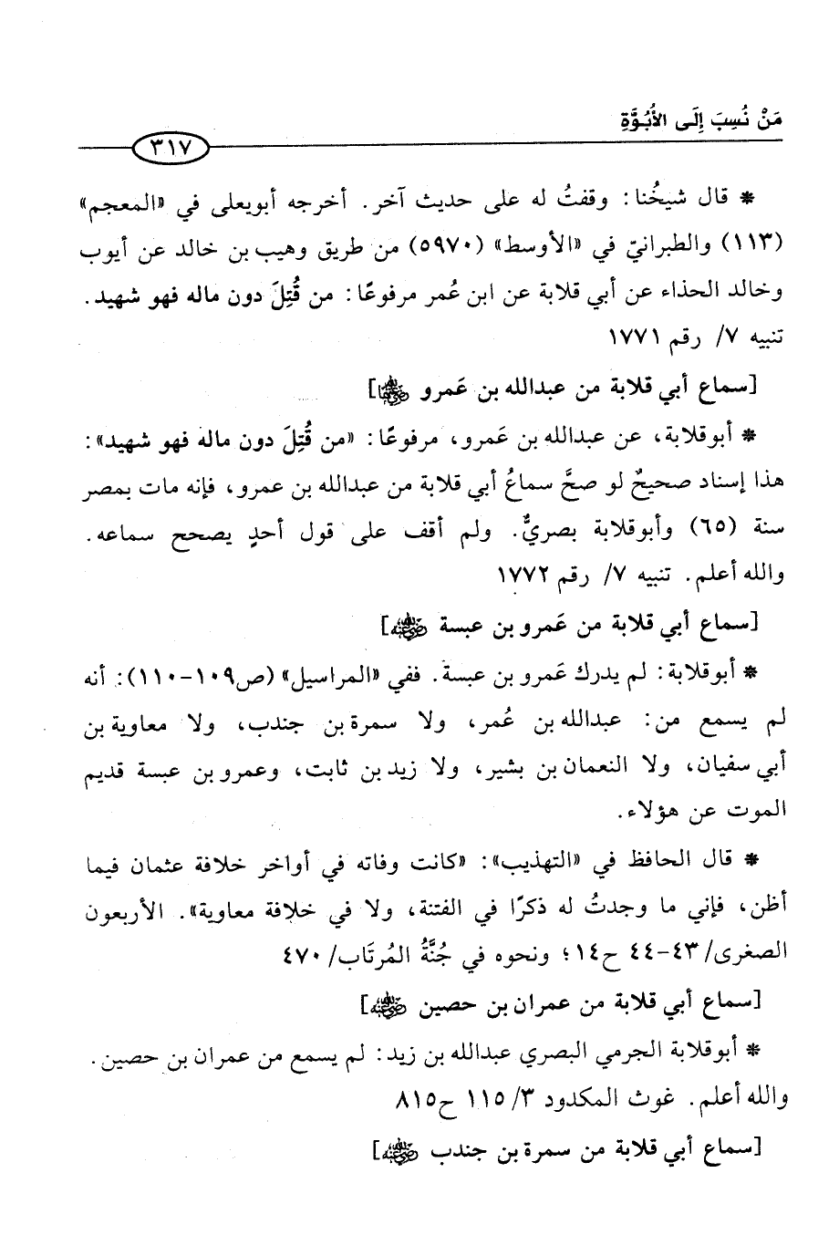 * أبو قلابة، عن عبد الله بن عَمرو، مرفوعًا: "من قُتِلَ دون ماله فهو شهيد": هذا إسناد صحيحٌ لو صحَّ سماعُ أبي قلابة من عبد الله بن عمرو، فإنه مات بمصر سنة (65) وأبو قلابة بصريٌّ. ولم أقف على قول أحدٍ يصحح سماعه. والله أعلم. تنبيه 7/ رقم 1772