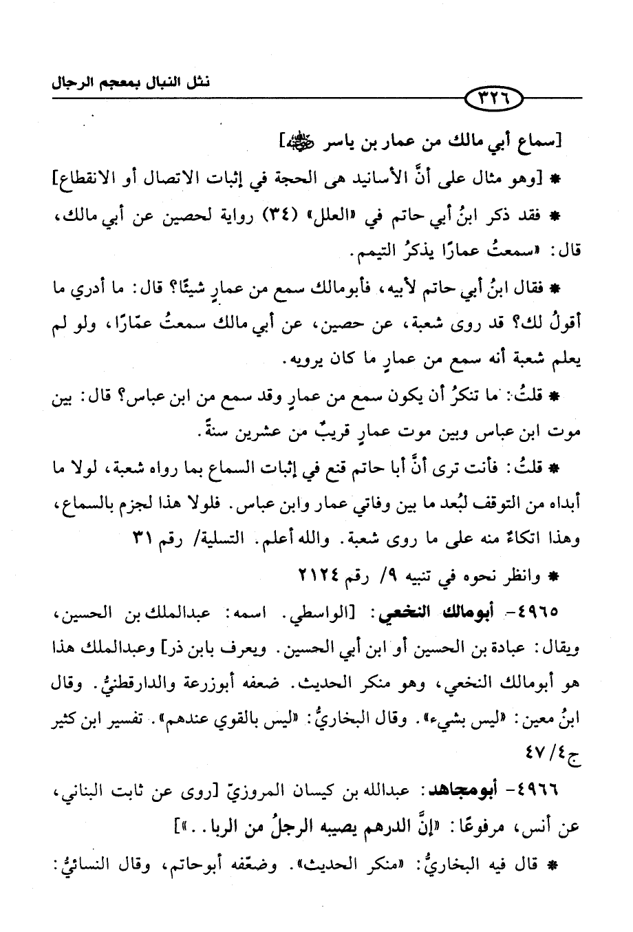 * فقال ابنُ أبي حاتم لأبيه، فأبو مالك سمع من عمارٍ شيئًا؟ قال: ما أدري ما أقولُ لك؟ قد روى شعبة، عن حصين، عن أبي مالك سمعتُ عمّارًا، ولو لم يعلم شعبة أنه سمع من عمارٍ ما كان يرويه.