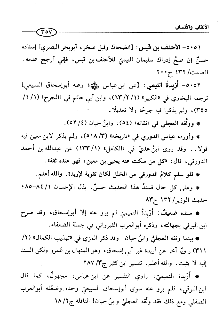 5051 - الأحنف بن قيس: [الضحاك وقيل صخر، أبو بحر البصري] إسناده حسنٌ إن صحَّ إدراك سليمان التيميّ للأحنف بن قيس، فإني أرجح عدمه. الصمت / 132 ح 200