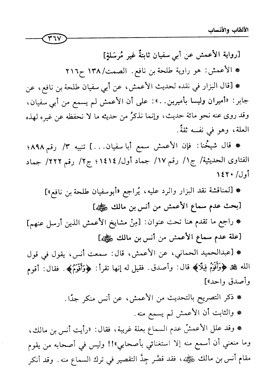 * وقد علل الأعمشُ عدم السماع بعلة غريبة، فقال: "رأيت أنس بن مالك، وما منعني أن أسمع منه إلا استغنائي بأصحابي"!! وليس في أصحابه من يقوم مقام أنس بن مالك -رَضِيَ الله عَنْهُ-، فقد قصَّر جِدَّ التقصير في ترك السماع منه. وقد أنكر