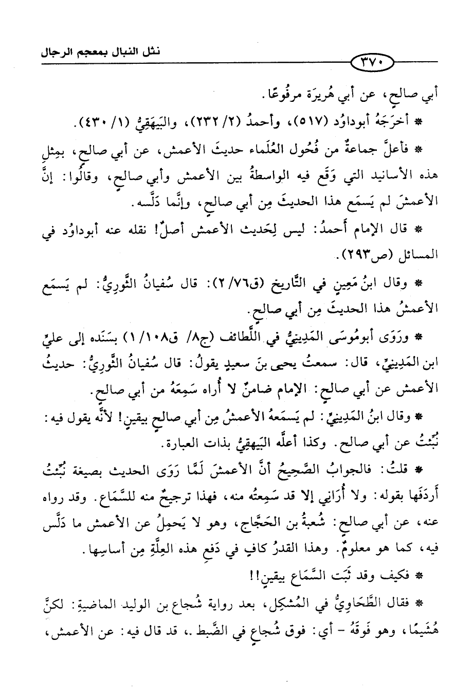 * وقال ابنُ المَدِينيِّ: لم يَسمَعهُ الأعمشُ مِن أبي صالحٍ بيقينٍ! لأنَّه يقول فيه: نُبئتُ عن أبي صالح. وكذا أعلَّه البَيهقيُّ بذات العبارة.