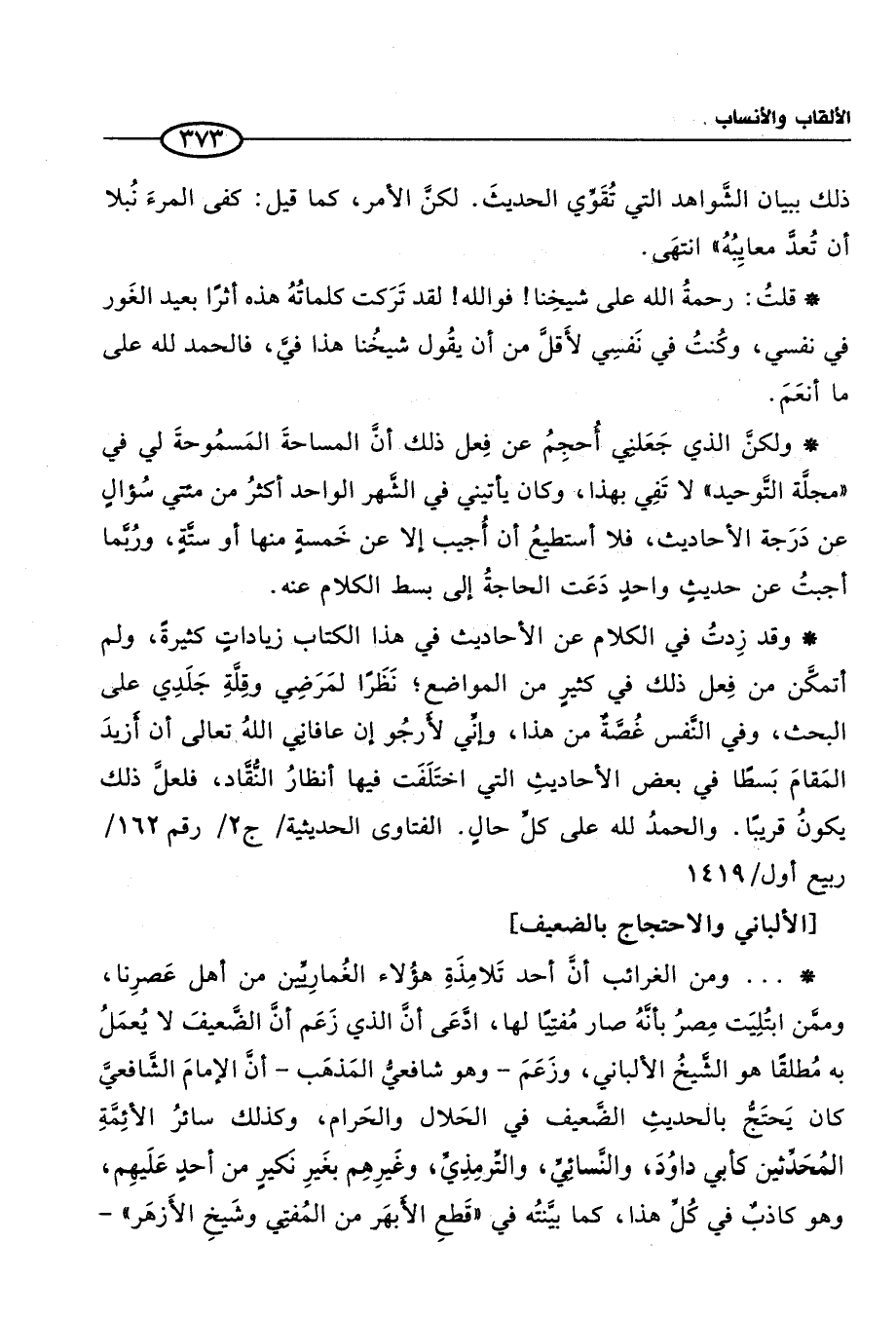 * وقد زِدتُ في الكلام عن الأحاديث في هذا الكتاب زياداتٍ كثيرةً، ولم أتمكَّن من فِعل ذلك في كثيرٍ من المواضع؛ نَظَرًا لمَرَضِي وقِلَّةِ جَلَدِي على البحث، وفي النَّفس غُصَّةٌ من هذا، وإنِّي لأرجُو إن عافاني اللهُ تعالى أن أزيدَ المَقامَ بَسطًا في بعض الأحاديثِ التي اختَلَفَت فيها أنظارُ النُّقَّاد، فلعلَّ ذلك يكونُ قريبًا. والحمدُ لله على كلِّ حالٍ. الفتاوى الحديثية / ج 2/ رقم 162/ ربيع أول / 1419