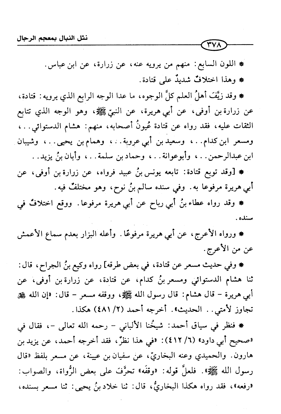 * وقد زيَّف أهلُ العلم كلَّ الوجوه، ما عدا الوجه الرابع الذي يرويه: قتادة، عن زرارة بن أوفى، كن أبي هريرة، عن النبيّ -صلى الله عليه وسلم-، وهو الوجه الذي تتابع الثقات عليه، فقد رواه عن قتادة عُيونُ أصحابه، منهم: هشام الدستوائي. .، ومسعر ابن كدام. .، وسعيد بن أبي عروبة. .، وهمام بن يحيى. .، وشيبان ابن عبد الرحمن. .، وأبو عوانة. .، وحماد بن سلمة. .، وأبان بنُ يزيد. .