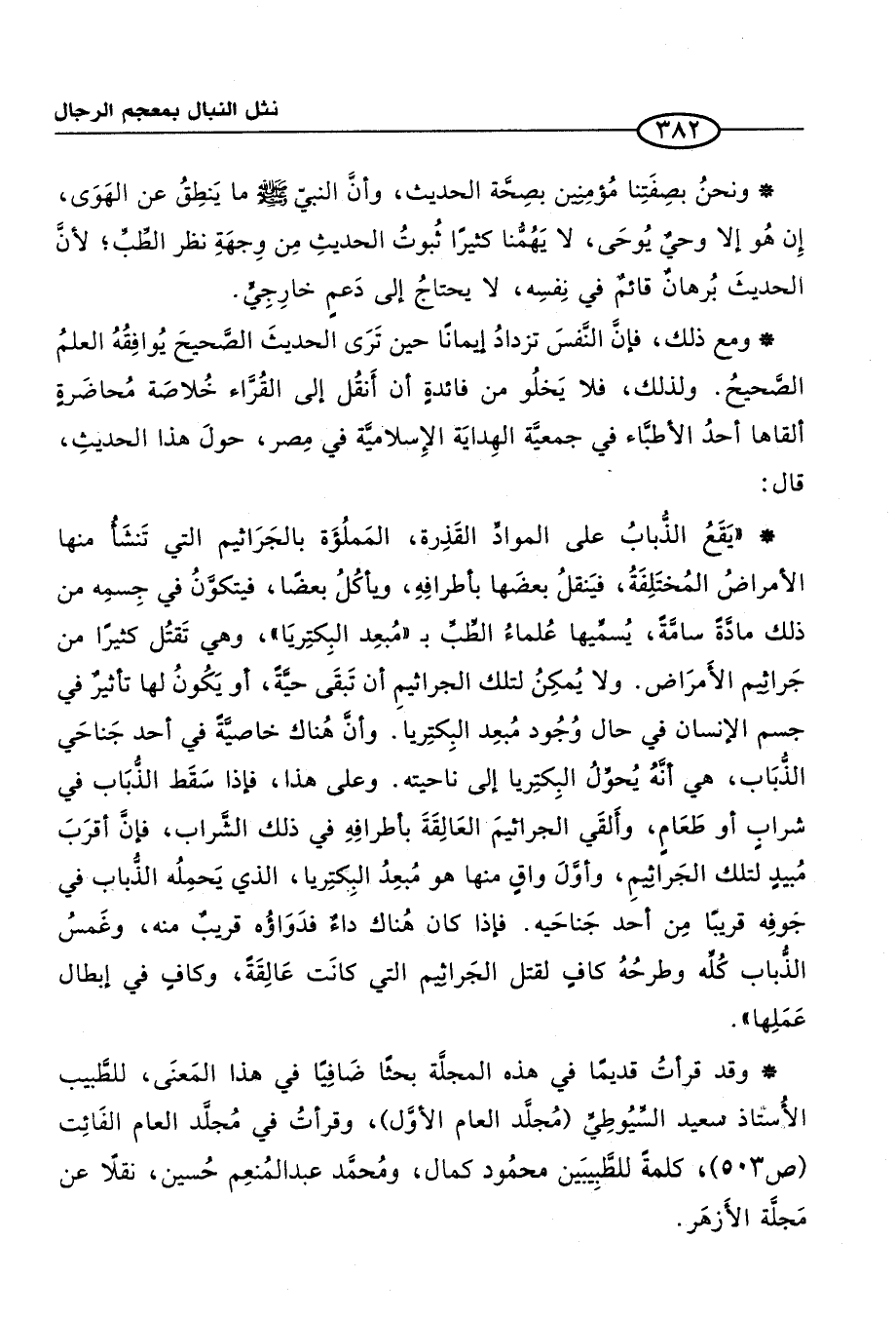 * ونحنُ بصِفَتِنا مُؤمِنين بصِحَّة الحديث، وأنَّ النبيّ -صلى الله عليه وسلم- ما يَنطِقُ عن الهَوَى، إِن هُو إلا وحيٌ يُوحَى، لا يَهُمُّنا كثيرًا ثُبوتُ الحديثِ مِن وِجهَةِ نظر الطّبِّ؛ لأنَّ الحديثَ بُرهانٌ قائمٌ في نِفسِه، لا يحتاجُ إلى دَعمٍ خارِجِيٌّ.