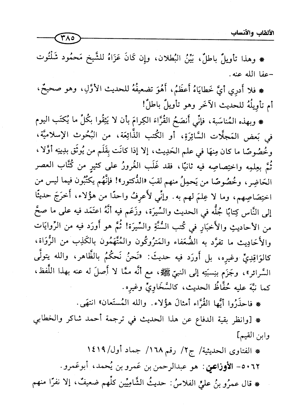 * وبهذه المُناسَبة، فإنِّي أَنصَحُ القُرَّاءَ الكِرامَ بأن لا يَثِقُوا بكلِّ ما يُكتَب اليوم في بَعض المَجلَّات السَّائرَةِ، أو الكُتب الذَّائِعَة، من البُحُوث الإِسلاميَّة، وخُصُوصًا ما كان مِنهَا في علم الحَدِيث، إلا إذا كانَت بِقَلَم من يُوثَق بدِينِه أوَّلا، ثُمَّ بعِلمِه واختِصاصِه فيه ثانيًا، فقد غَلَب الغُرورُ على كثيرٍ من كُتَّاب العصر الحَاضِر، وخُصُوصًا من يَحمِلُ منهم لقبَ "الدُّكتور" فإنَّهُم يكتبون فيما ليس من اختِصَاصِهم، وما لا عِلمَ لهم به. وإنِّي لأَعرِفُ واحدًا من هؤُلاء، أَخرَجَ حديثًا إلى النَّاس كِتابًا جُلُّه في الحديث والسِّيرَة، وزَعَم فيه أنَّهُ اعتَمَد فيه على ما صحَّ من الأحاديثِ والأَخبَارِ في كُتب السُّنَّةِ والسِّيرَة! ثُمَّ هو أَورَد فيه من الرِّوايَات والأَحَادِيث ما تفرَّد به الضُّعَفاء والمَترُوكُون والمُتَّهَمُون بالكَذِب من الرُّوَاة، كالوَاقِدِيِّ. وغيرِه، بل أَورَد فيه حديثَ: "نَحنُ نَحكمُ بالظَّاهر، والله يتولَّى السَّرائر"، وجَزَم بنِسبَتِه إلى النبيّ -صلى الله عليه وسلم-، مع أنَّه ممَّا لا أَصلَ له عنه بهذا اللَّفظ، كما نبَّهَ عليه حُفَّاظُ الحديث، كالسَّخَاوِيِّ وغيرِه.