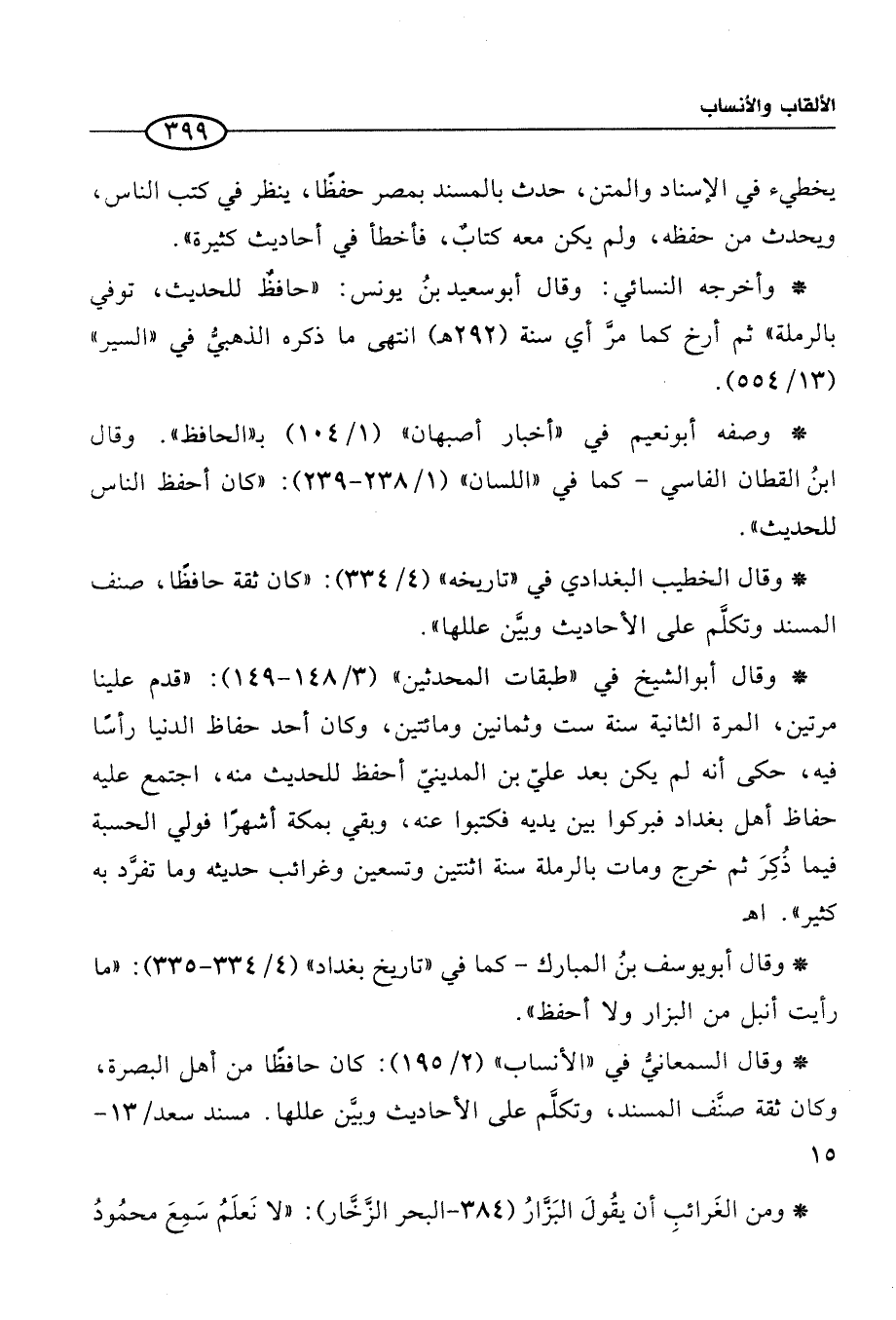 * وأخرجه النسائي: وقال أبو سعيد بنُ يونس: "حافظٌ للحديث، توفي بالرملة" ثم أرخ كما مرَّ أي سنة (292 هـ) انتهى ما ذكره الذهبيُّ في "السير" (13/ 554).
