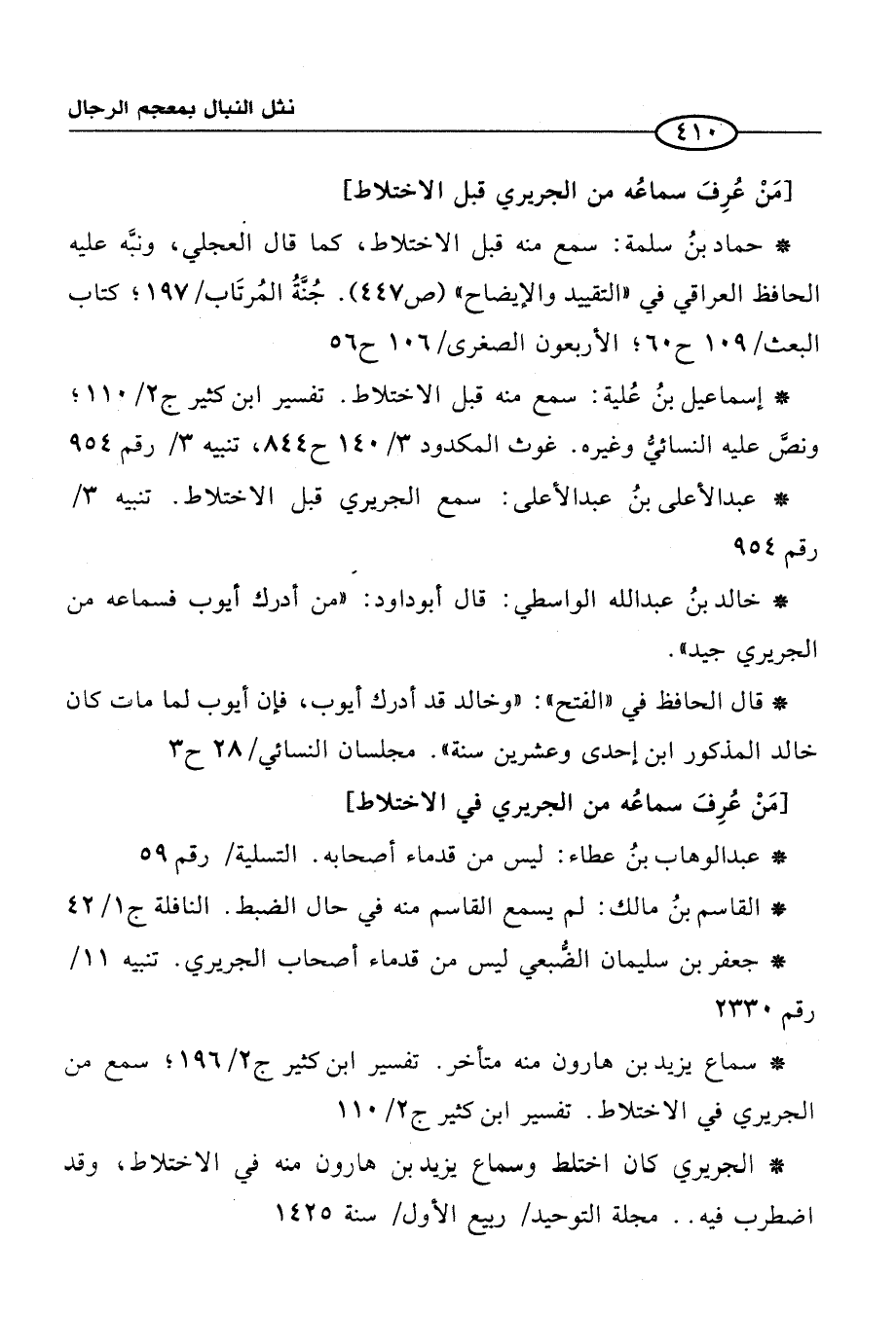* إسماعيل بنُ عُلية: سمع منه قبل الاختلاط. تفسير ابن كثير ج 2/ 110؛ ونصَّ عليه النسائيُّ وغيره. غوث المكدود 3/ 140 ح 844، تنبيه 3/ رقم 954